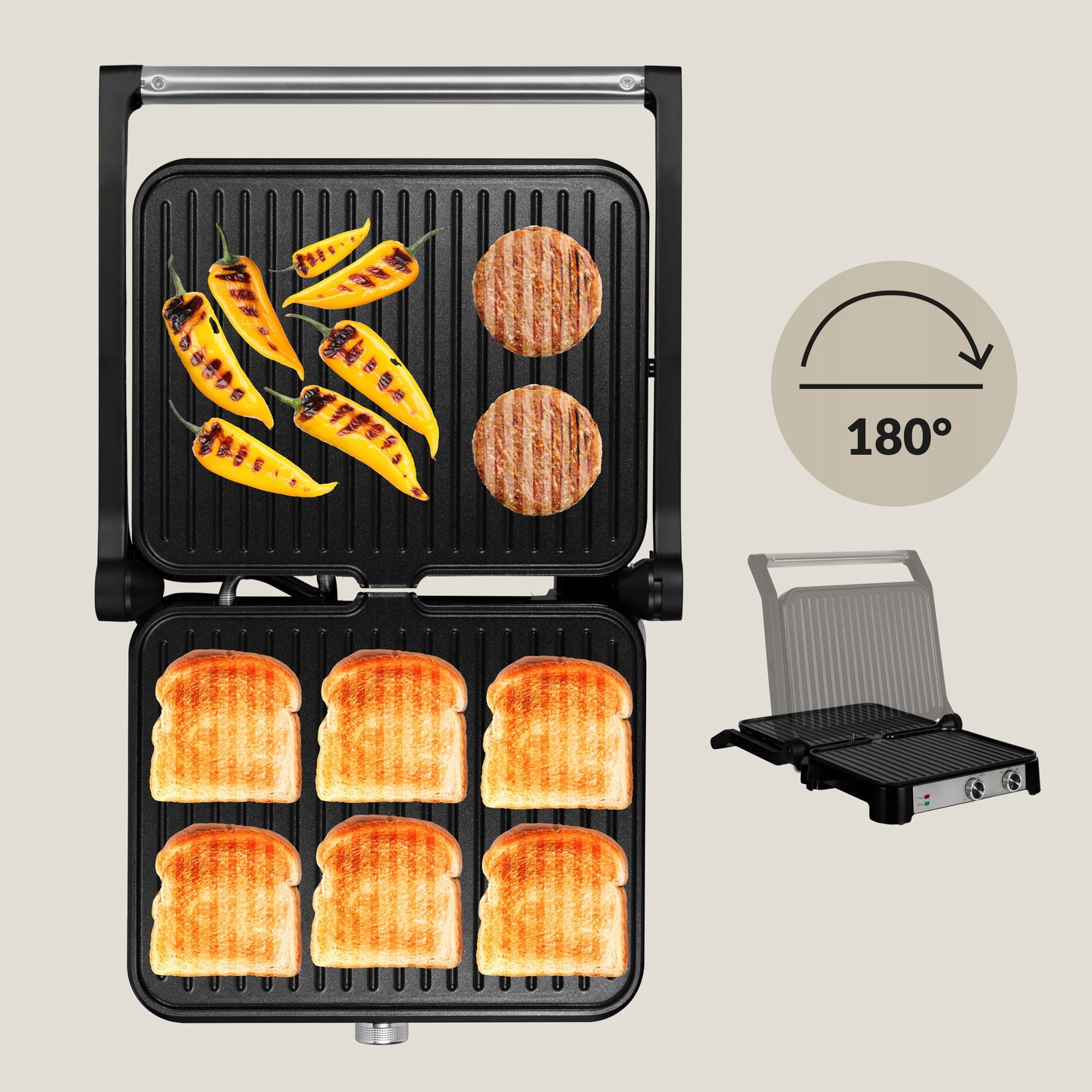 Pełne otwarcie pokrywy o 180° pozwala podwoić powierzchnię grillowania, dzięki czemu możesz jednocześnie przygotować większe ilości jedzenia. To doskonałe rozwiązanie na rodzinne obiady, spotkania z przyjaciółmi lub miłe spędzenie czasu w samotności. Grilluj tak, jak lubisz – kiełbaski, szaszłyki i karkówkę na otwartym grillu lub tosty, panini i warzywa z zamkniętą pokrywą.