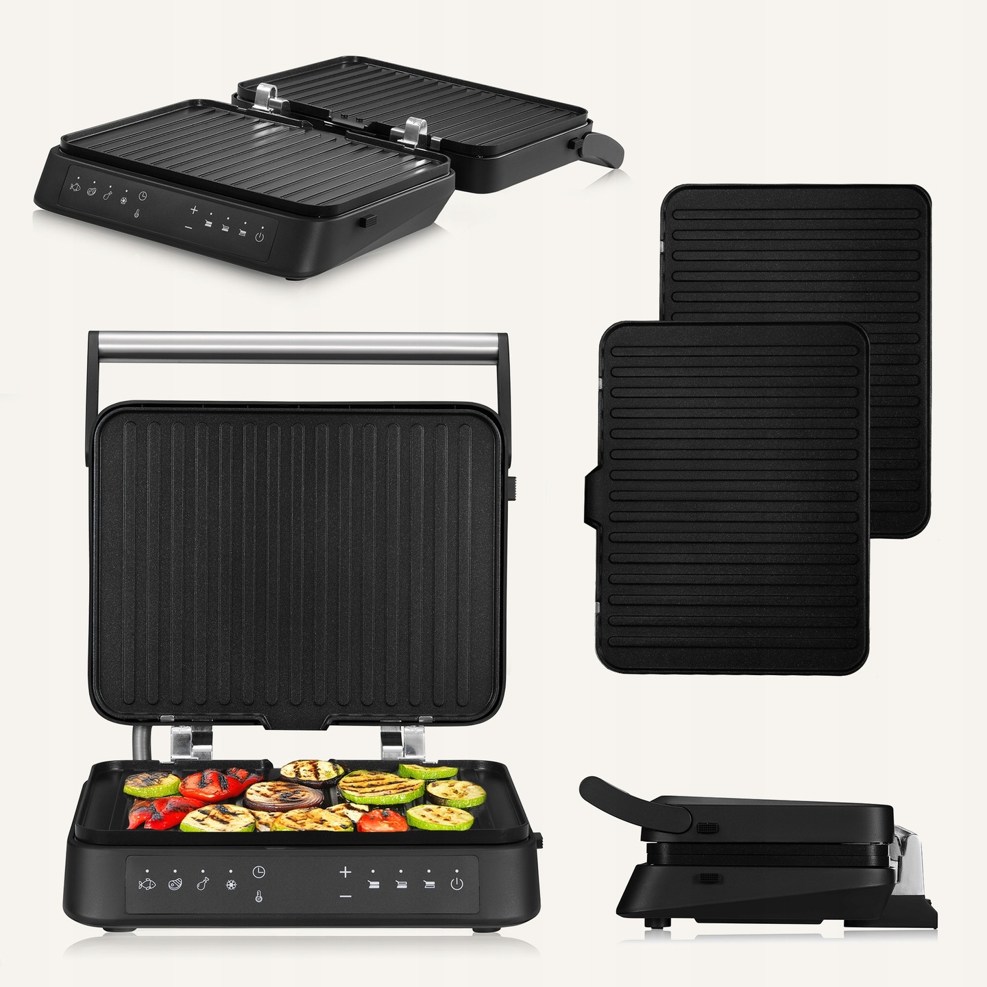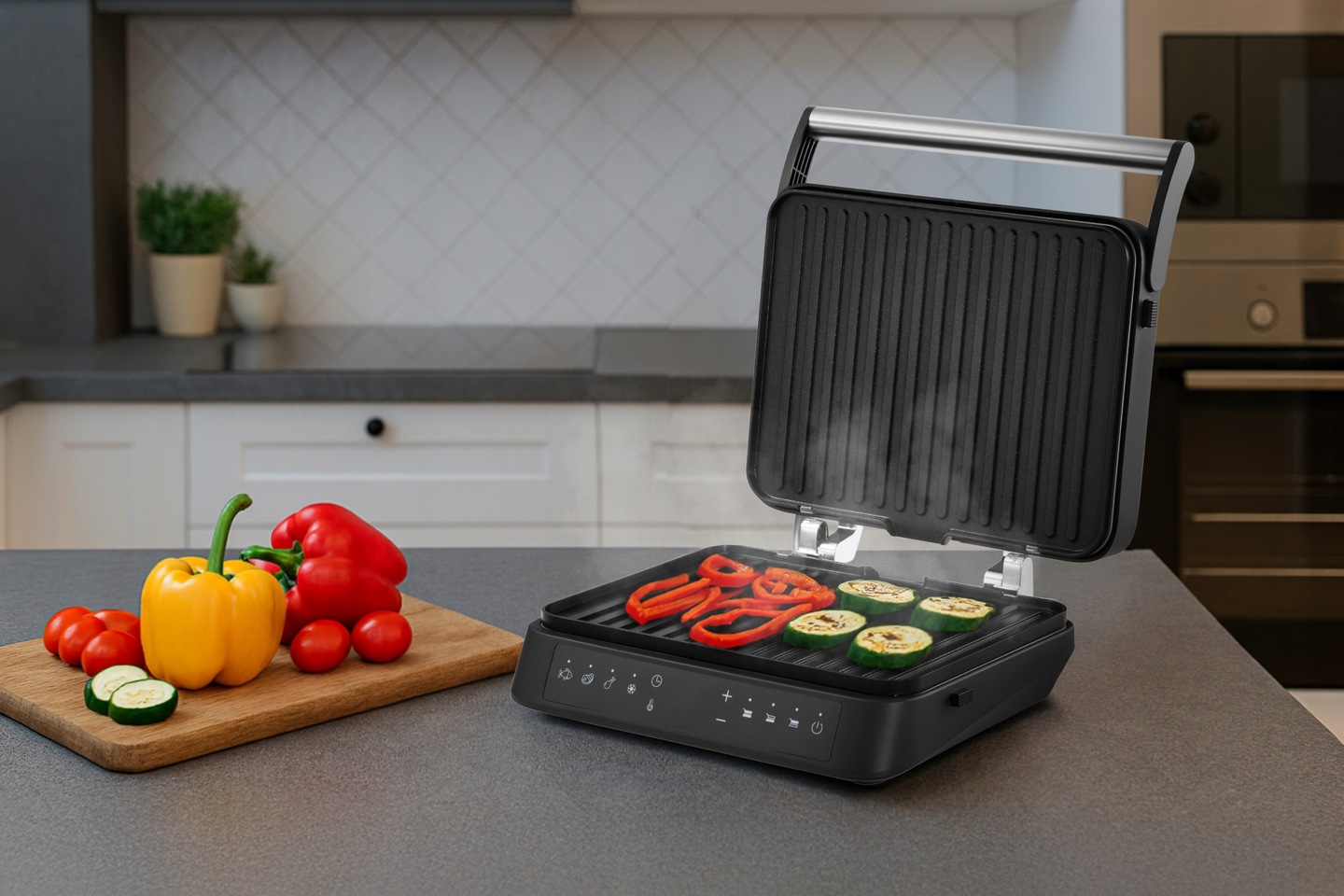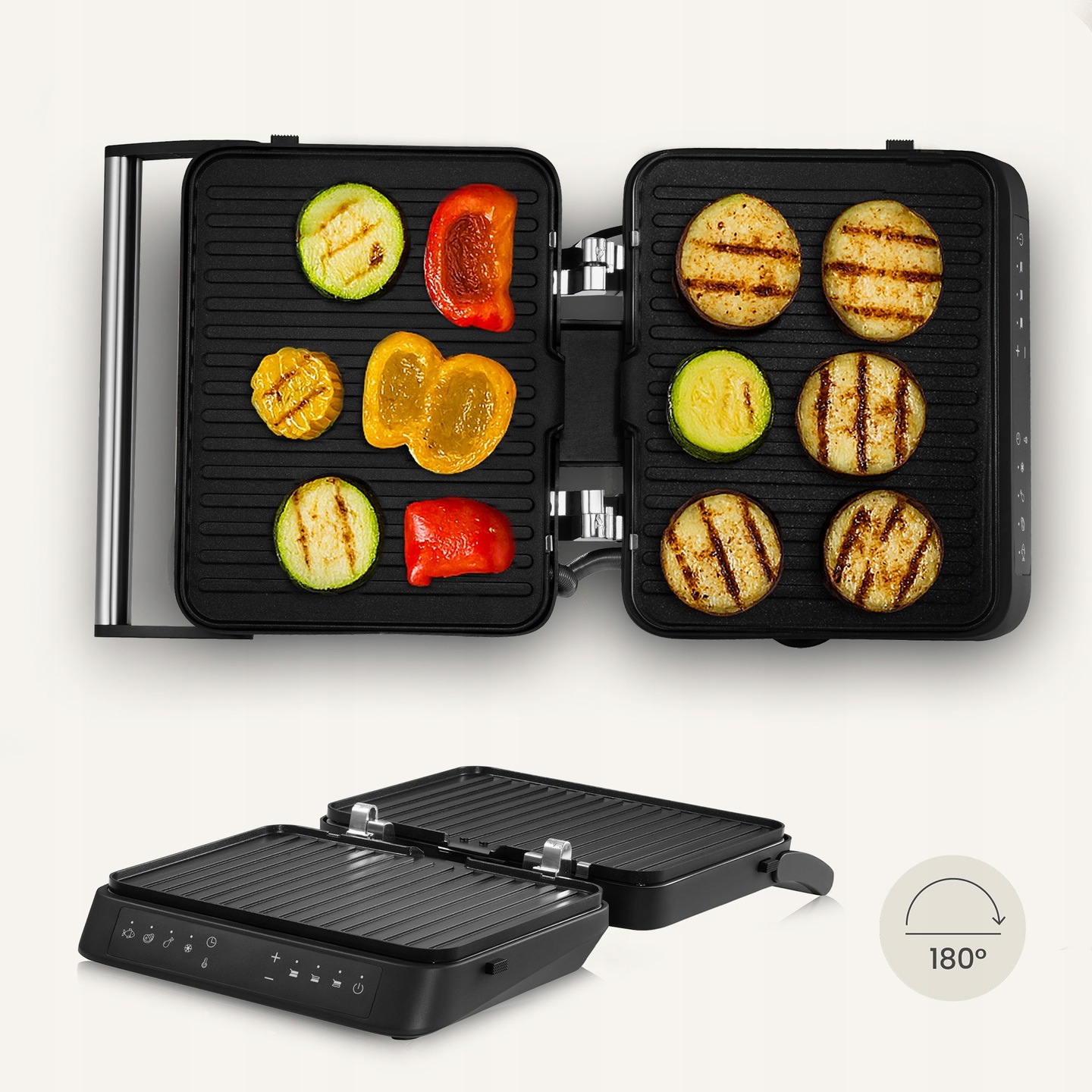 Urządzenie może pracować w pozycji rozłożonej lub zamkniętej, co umożliwia przygotowanie różnorodnych potraw – od grillowanych mięs po kanapki typu panini czy zapiekanki.