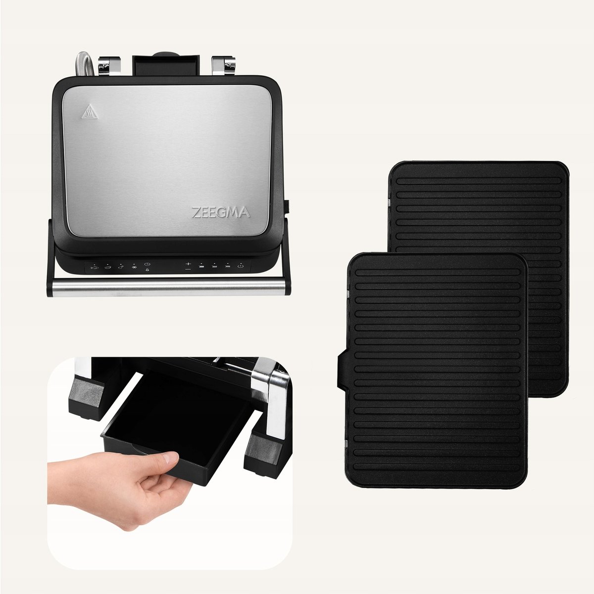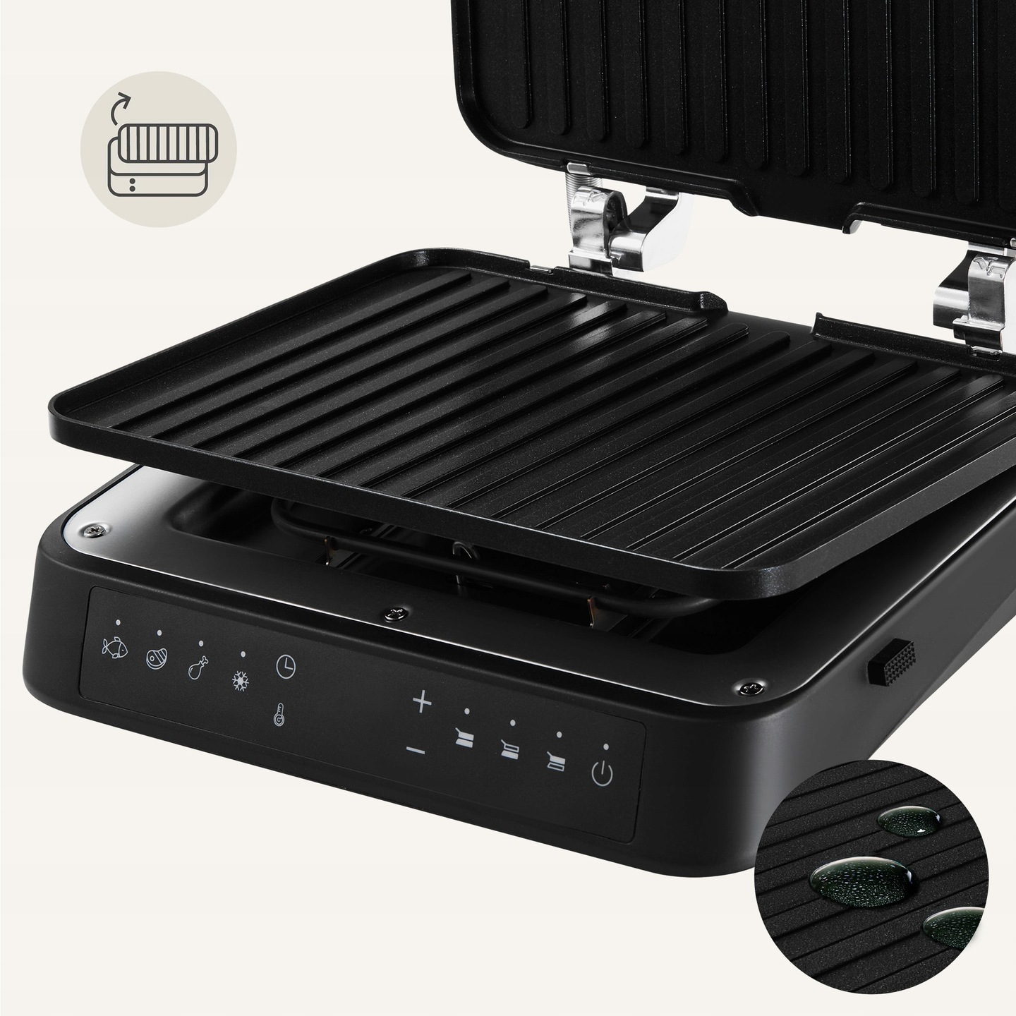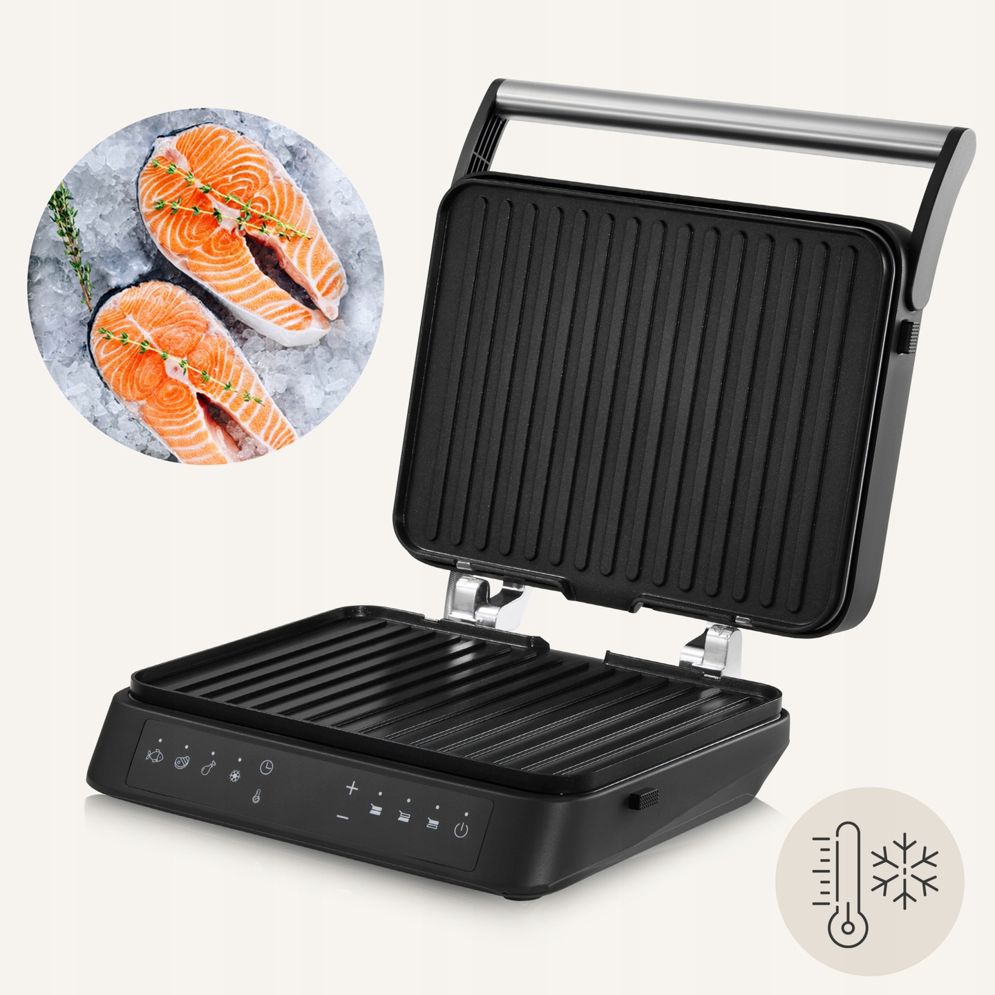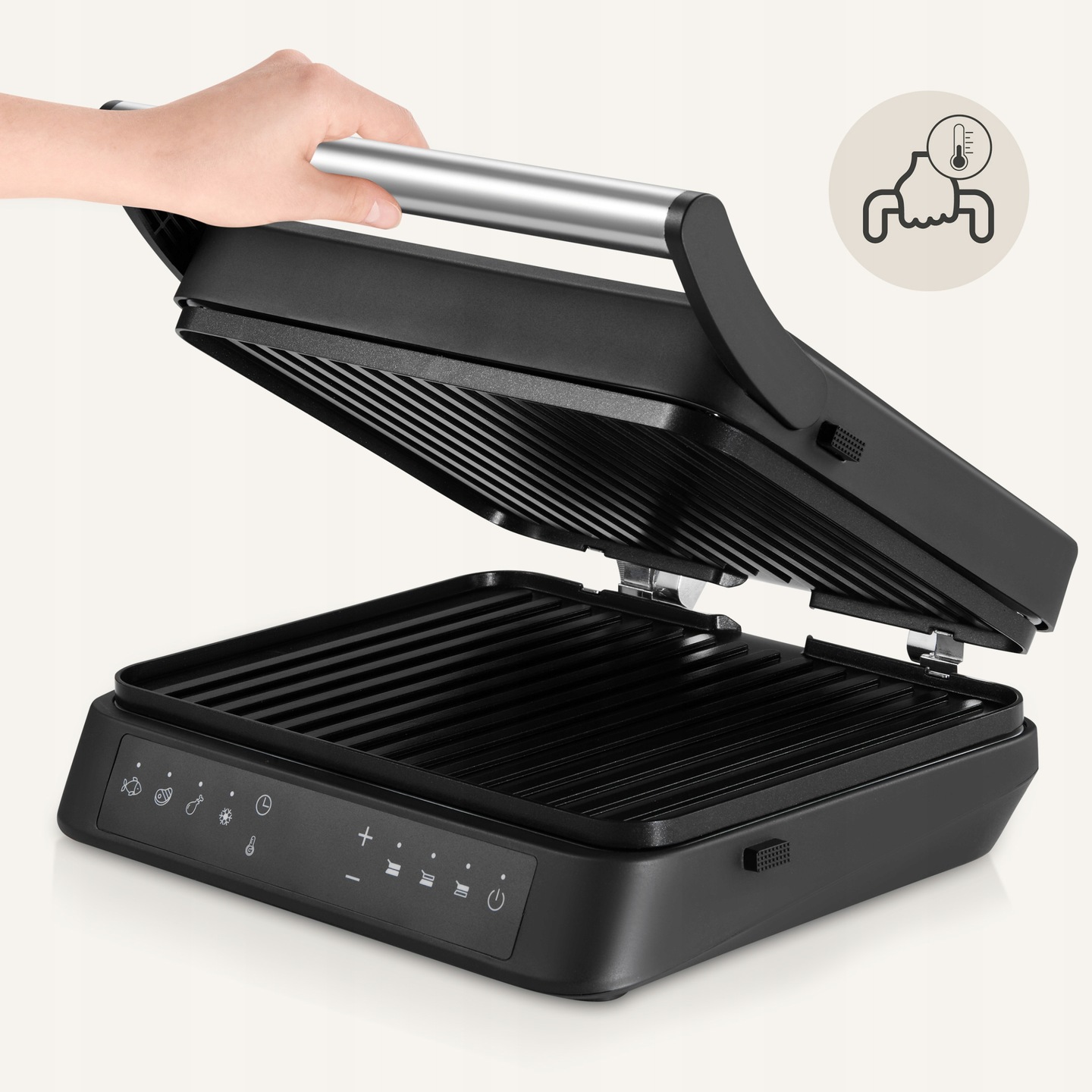 Urządzenie może pracować w pozycji rozłożonej lub zamkniętej, co umożliwia przygotowanie różnorodnych potraw – od grillowanych mięs po kanapki typu panini czy zapiekanki.