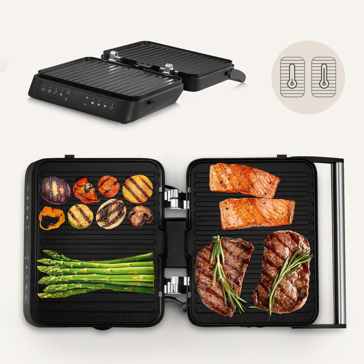 Dzięki osobnej regulacji temperatury górnej i dolnej płyty możesz przygotować różnorodne potrawy równocześnie. To idealna funkcja podczas korzystania z grilla w pozycji otwartej (na płasko) – np. warzywa po jednej stronie, mięso po drugiej.