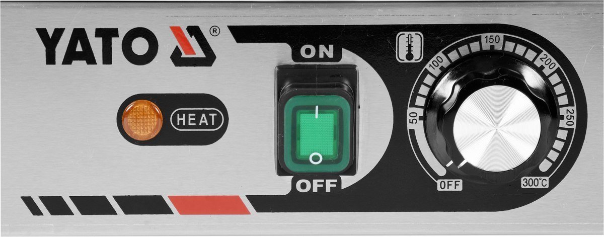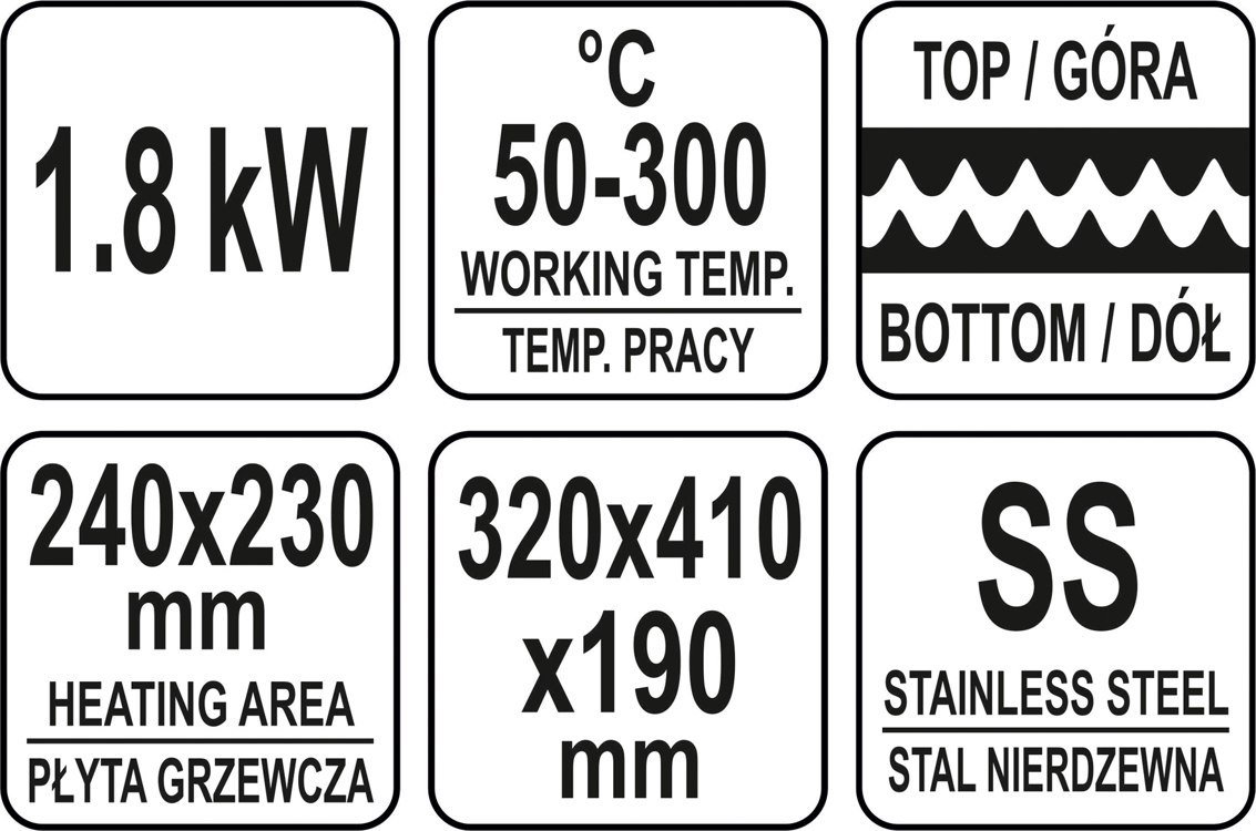 Grzałka o mocy 1,8 kW jest sterowana za pomocą potencjometru, pozwalającego na regulację temperatury w zakresie 50-300℃.