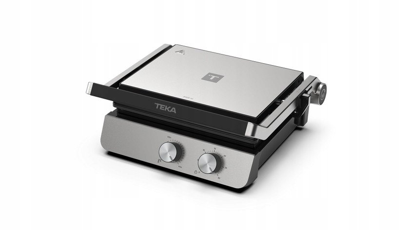 TEKA T‑Grill SS to wszechstronny elektryczny grill kontaktowy o eleganckim, stalowym designie, który idealnie wpasuje się w nowoczesną kuchnię. Dzięki regulowanemu termostatowi (150–230 °C) sprawdzi się przy przygotowywaniu steków, panini, warzyw czy mięsa, zapewniając perfekcyjne efekty w każdej potrawie.