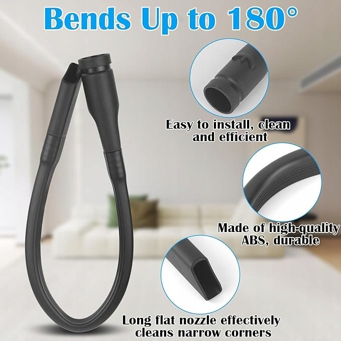 - Wąż przedłużający można zgiąć o 360° i rozciągnąć do 172 cm, a przedłużkę szczelinową można zgiąć o 180°. Można nim czyścić trudno dostępne zakamarki takie jak kanały suszarek, kanały grzewcze, boki lodówek, pod sprzętem kuchennym, a także wysokie i niskie powierzchnie oraz różne wąskie miejsca w samochodzie.