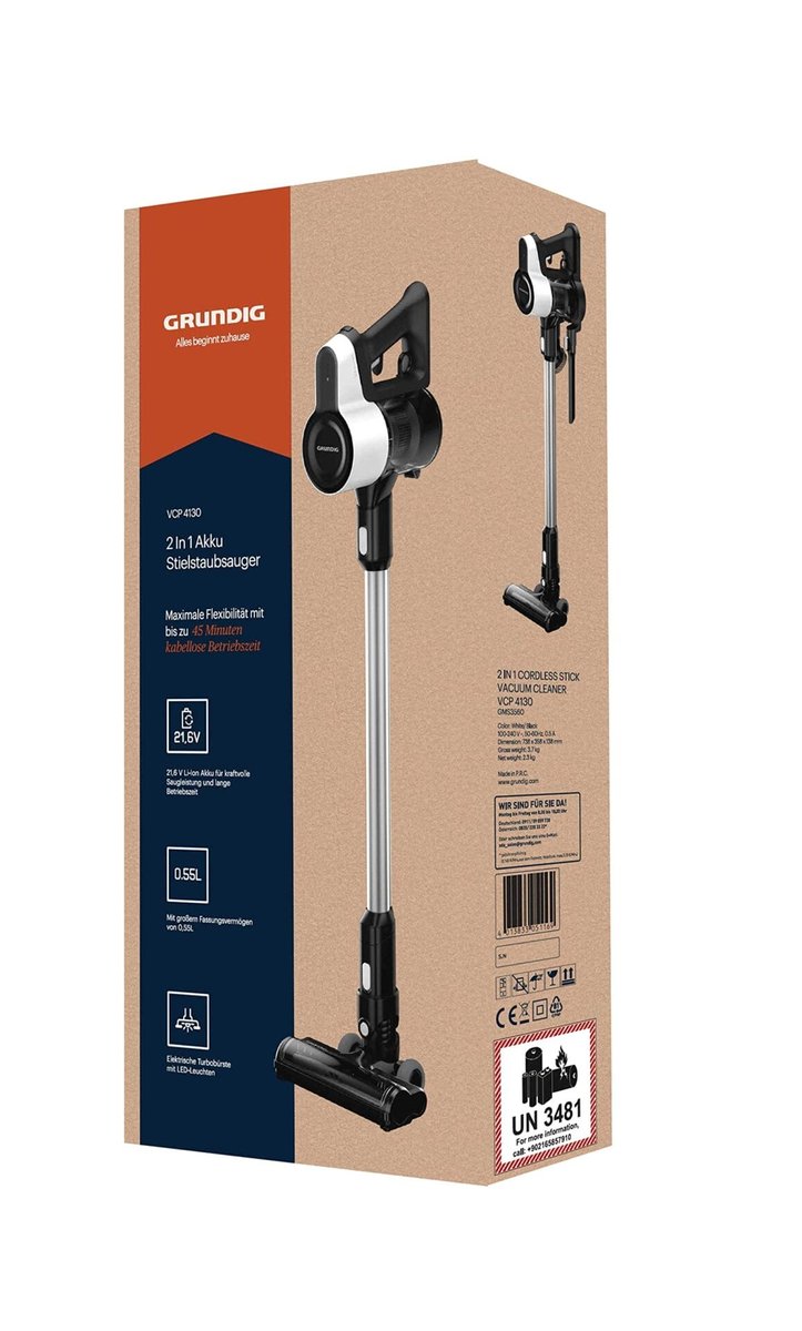 GRUNDIG VCP 4130 2 w 1 akumulatorowy odkurzacz z trzonkiem 2 poziomy siły GRUNDIG VCP 4130 to innowacyjny odkurzacz 2 w 1, który zapewnia wygodne i skuteczne sprzątanie. Ten akumulatorowy odkurzacz