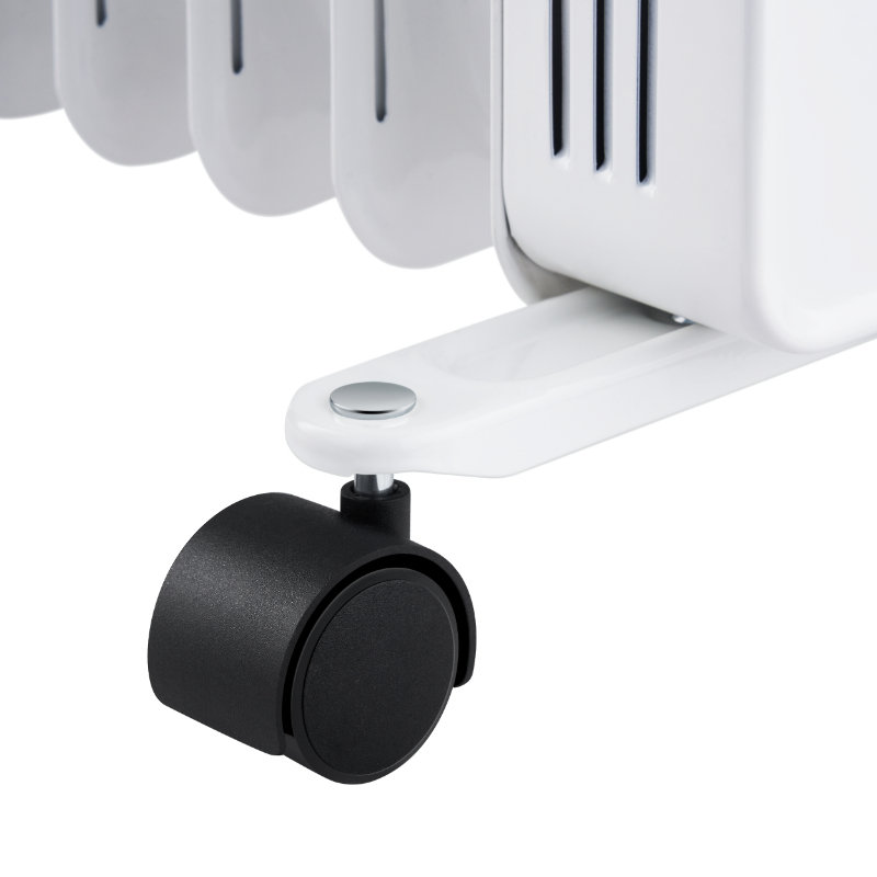Mobilność urządzenia zapewniają obrotowe kółka oraz wygodny uchwyt do przenoszenia. Grzejnik olejowy z termostatem jest także praktyczny dzięki uchwytowi na kabel, co pozwala na utrzymanie porządku.