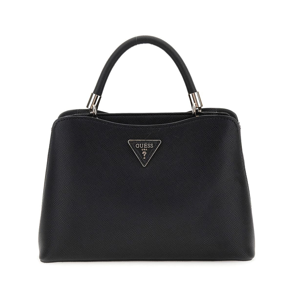 Damska torebka marki GUESS w kolorze czarnym wykonana jest z syntetycznej skóry na zewnętrznej stronie, co sprawia, że prezentuje się elegancko i stylowo. Torebka posiada praktyczne zapięcie na suwak, które umożliwia szybkie otwieranie i zamykanie. Elementy metalowe w kolorze srebrnym i jasnego złota dodają torebce wyjątkowego blasku i elegancji.