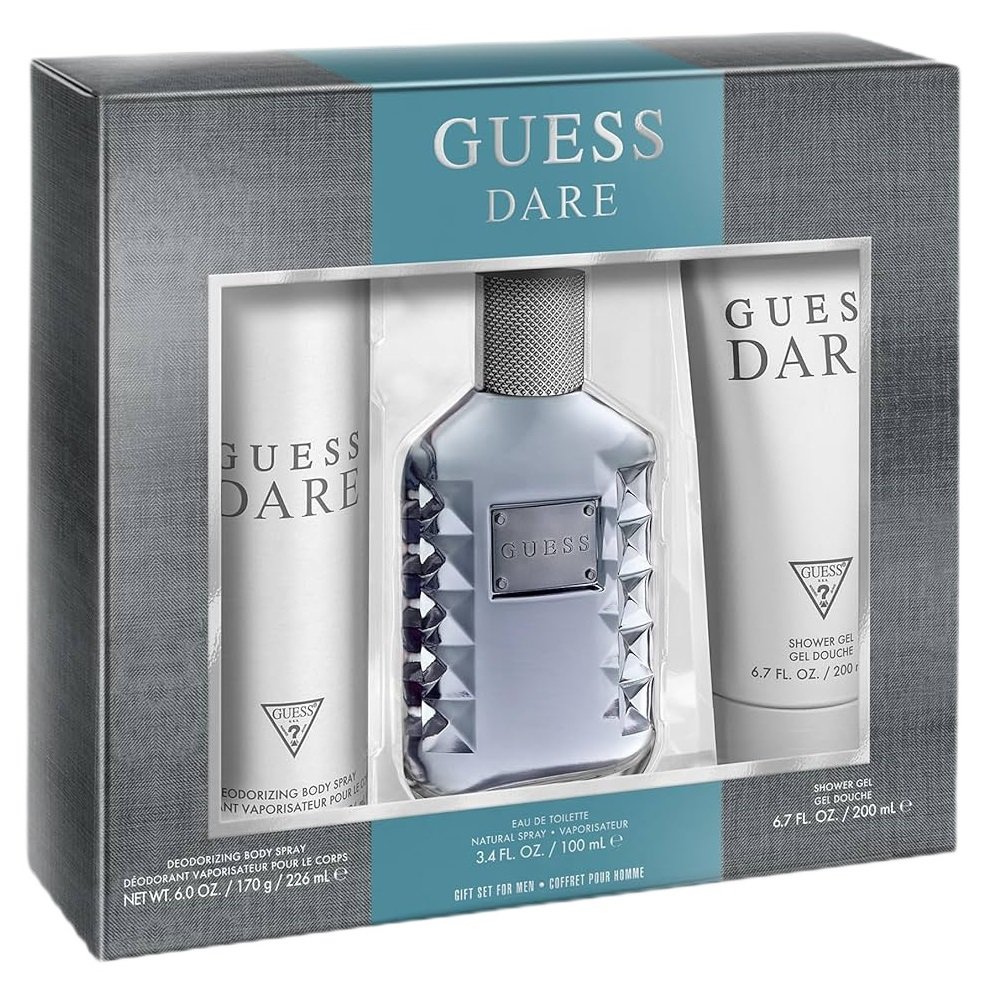 Podaruj mu prezent, który go zachwyci – GUESS Dare for Men. Wyjątkowy zapach, w którym nuty bergamotki, geranium i piżma tworzą niezapomnianą kompozycję, pełną męskiego uroku i pasji do przygód. W skład zestawu wchodzi woda toaletowa o pojemności 100ml, żel pod prysznic o pojemności 200ml oraz dezodorant w sprayu o pojemności 226ml.