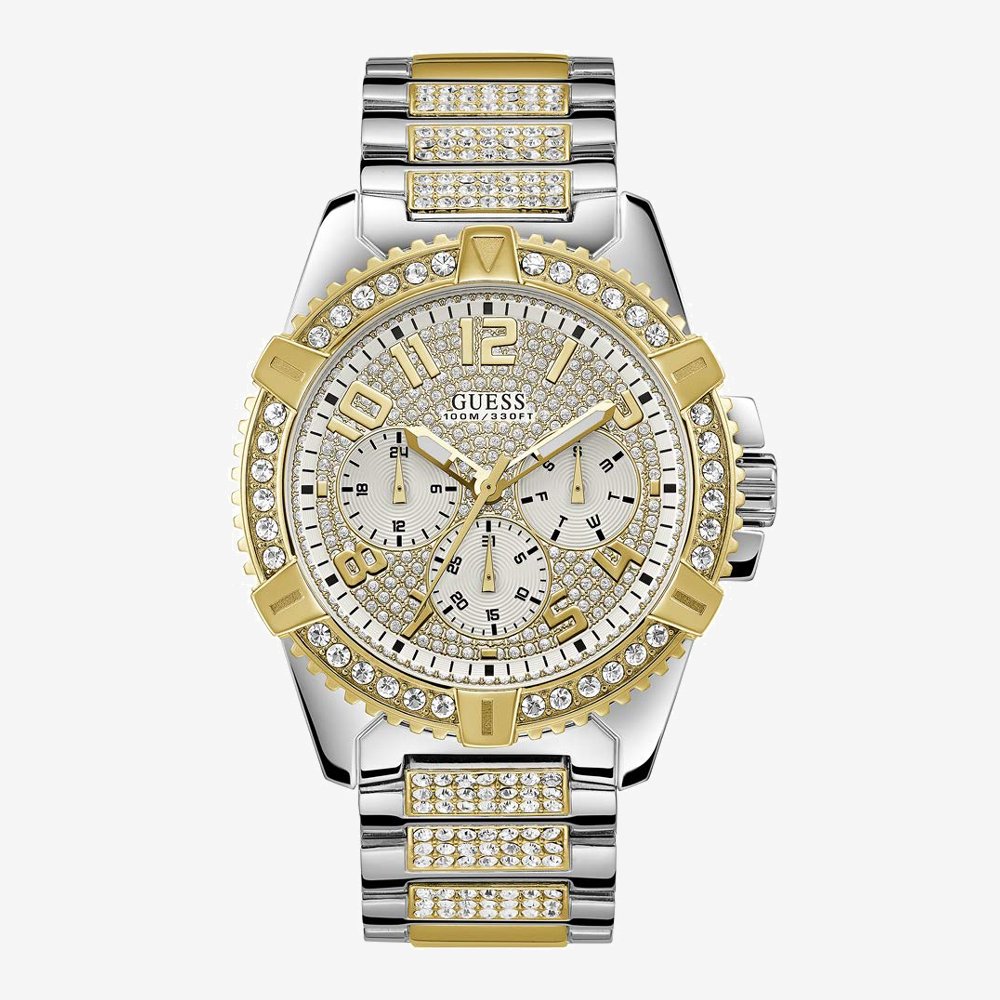 Guess Frontier Mens Watch W0799G4 Wielofunkcyjny. Obudowa ze stali nierdzewnej, powłoka w kolorze srebrnym i złotym, polerowana. Pasek ze stali nierdzewnej, powłoka w kolorze srebrnym i złotym, polerowana, składane zapięcie. Mechanizm kwarcowy, zasilany bateryjnie Wyświetlacz dnia tygodnia, wyświetlacz daty, wyświetlacz 24-godzinny Zestaw etui, paska i tarczy z kamieniami 100 metrów Wodoodporny