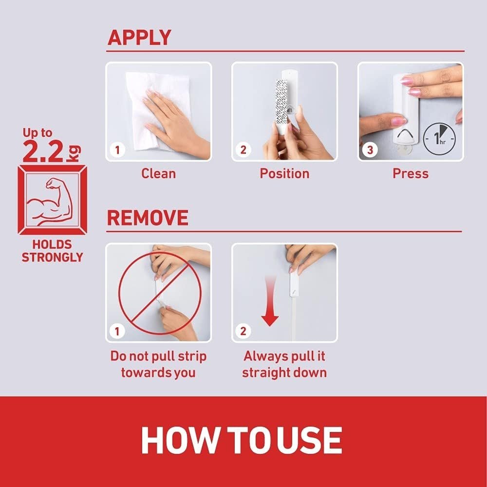 ✅ Prosty montaż- w komplecie z haczykiem znajdują się dwie dwustronne taśmy samoprzylepne, których montaż nie wymaga użycia żadnych narzędzi.
