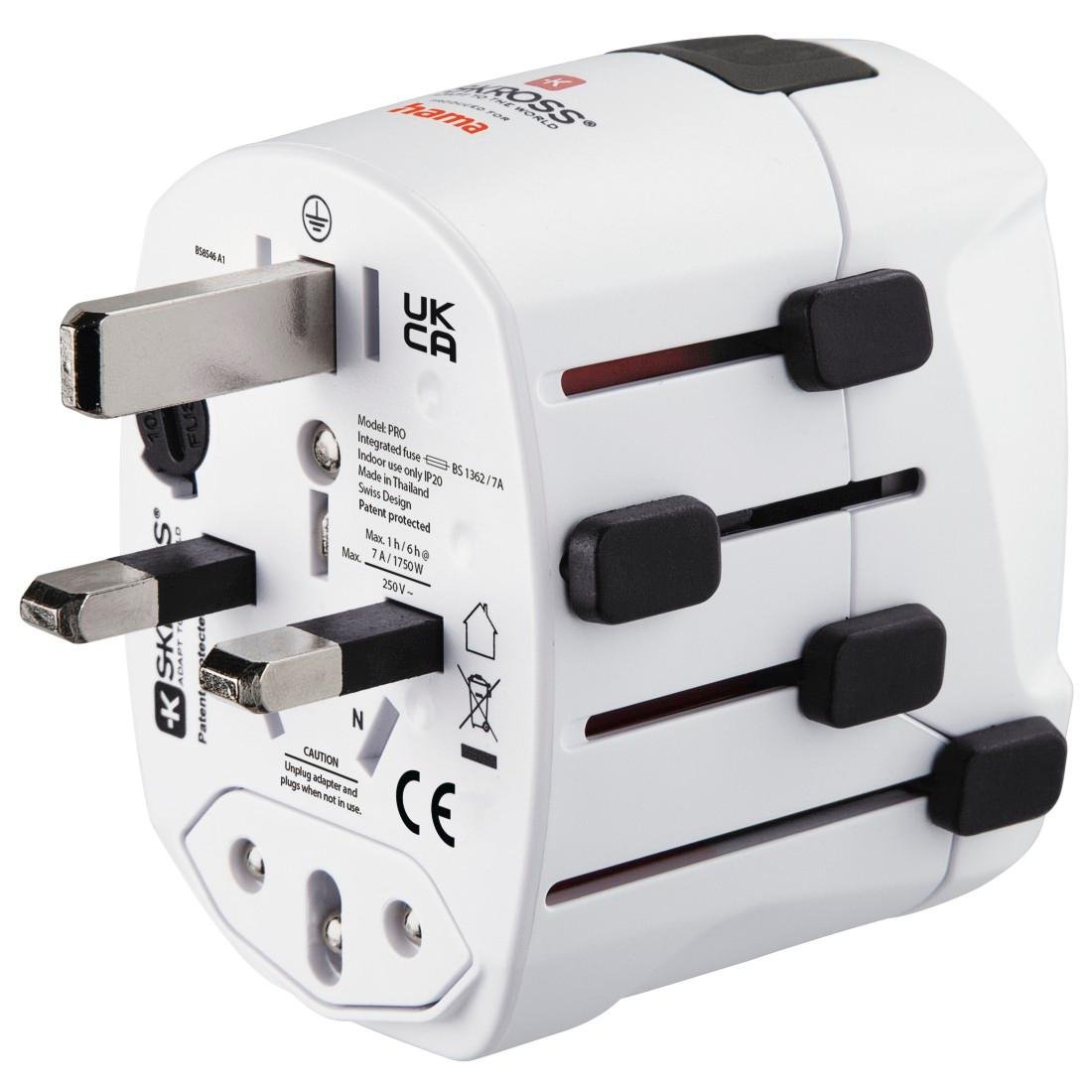Adapter podróżny Hama gwarantuje wysoki poziom bezpieczeństwa dzięki uziemionemu stykowi i zintegrowanemu, wymiennemu bezpiecznikowi. Działa z napięciami od 100V do 250V i pasuje do gniazd typu B, G, I, J, L i N oraz urządzeń z wtyczkami typu C, E i F.