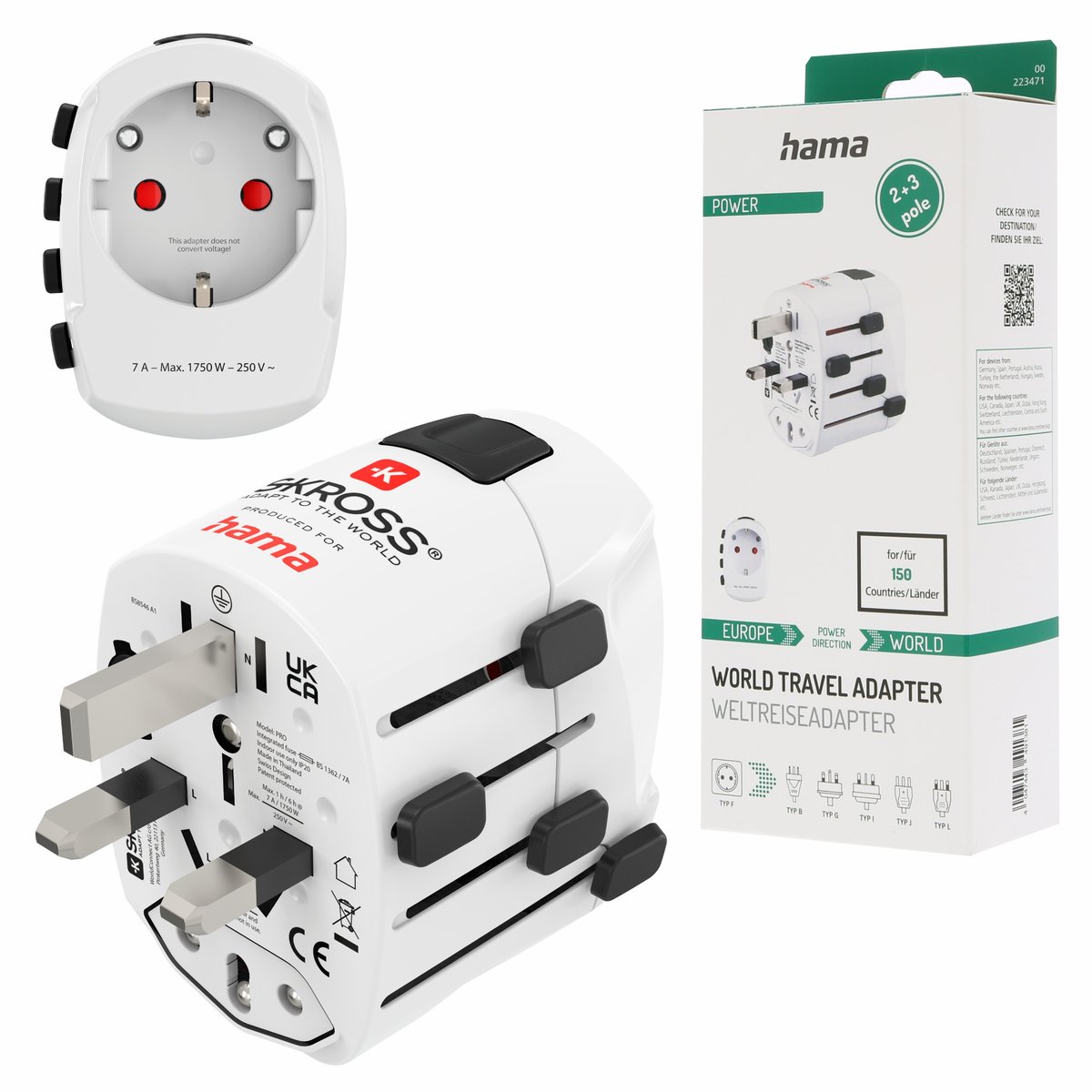 Uniwersalny adapter sieciowy Hama obsługuje urządzenia 2- i 3-biegunowe z uziemiającym kontaktem, konturem lub wtyczkami Euro. Idealny do podłączania zarówno uziemionych, jak i nieuziemionych urządzeń, takich jak aparaty fotograficzne, ładowarki do smartfonów, laptopy oraz podróżne suszarki do włosów.