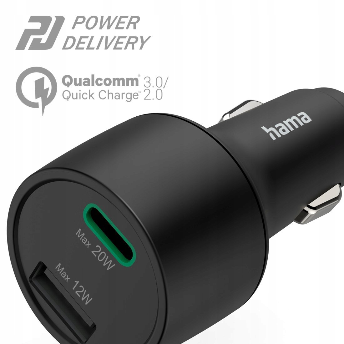Nowoczesna ładowarka samochodowa Hama została wyposażona w aż dwie technologie szybkiego ładowania: Qualcomm® Quick Charge™ 3.0 oraz Power Delivery. Gniazdo USB-C ładuje z maksymalną mocą 20 W, natomiast USB-A to 12 W mocy.