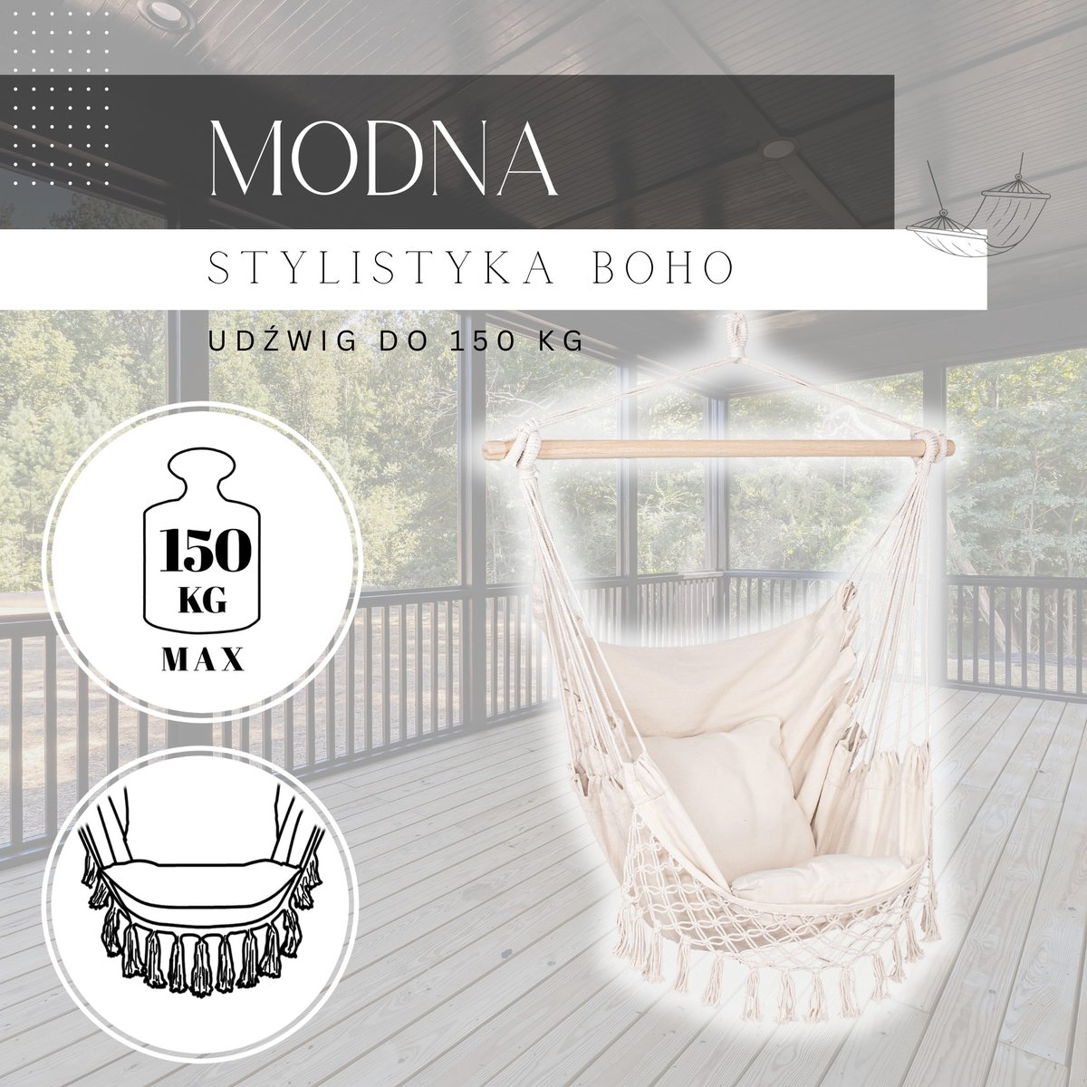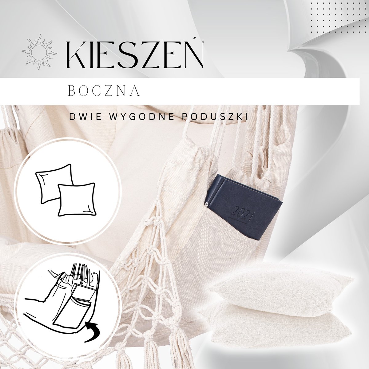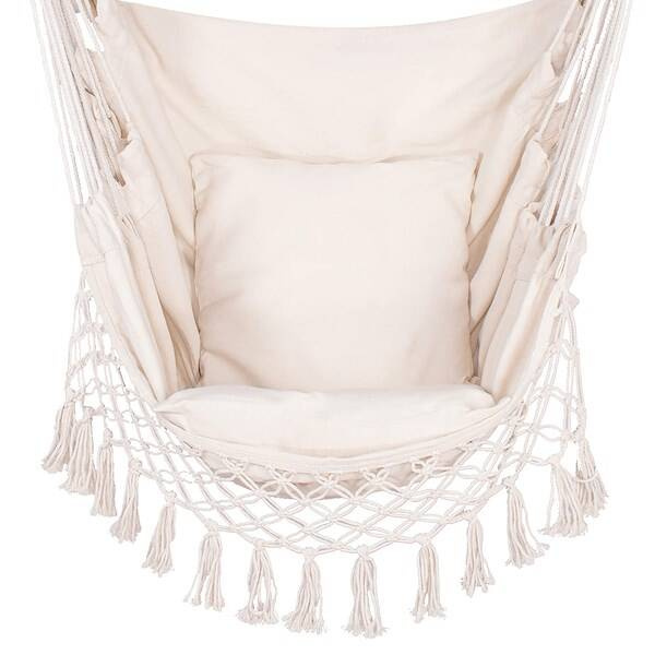 | Nazwa: | Fotel wiszący, hamak brazylijski z poduszkami, kremowy, 130x100 cm, Springos |
