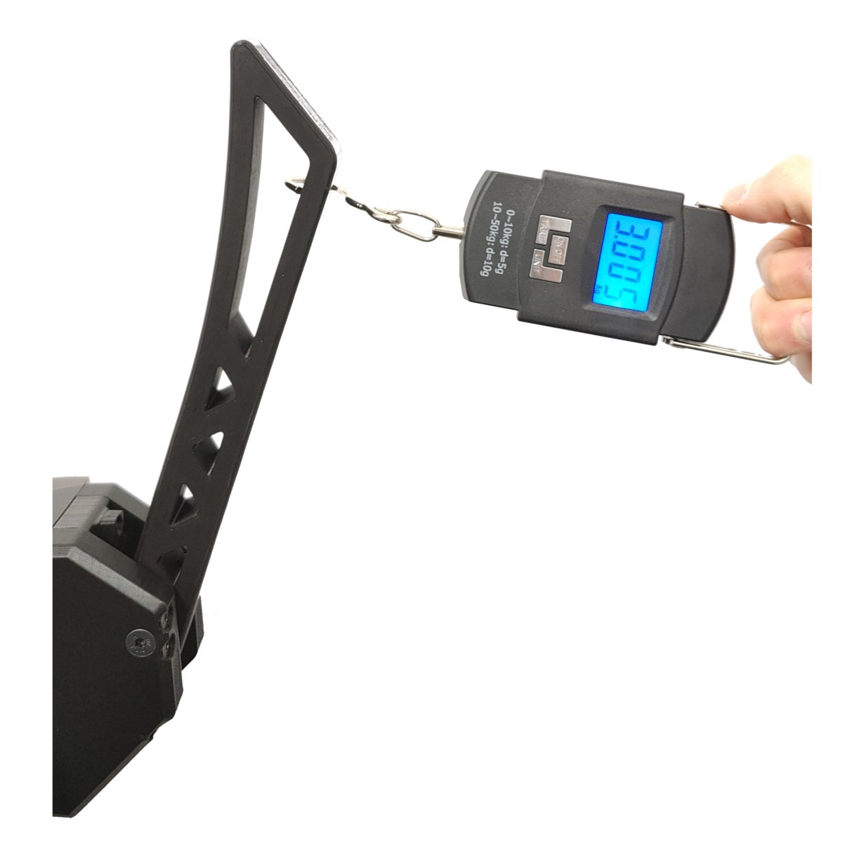 W hamulcu są zamontowane domyślnie 2 sprężyny, żeby zaciągnąć łapę do końca, trzeba użyć siły ok 3 kg, sprężyny można wyjmować i dostosować siłę zaciągania hamulca do swoich potrzeb. Zgodnie z tym co pokazuje zdjęcie, siłę potrzebną do zaciągniecia mozna ustawić od 1 kg przez 2 kg aż do 3 kg.