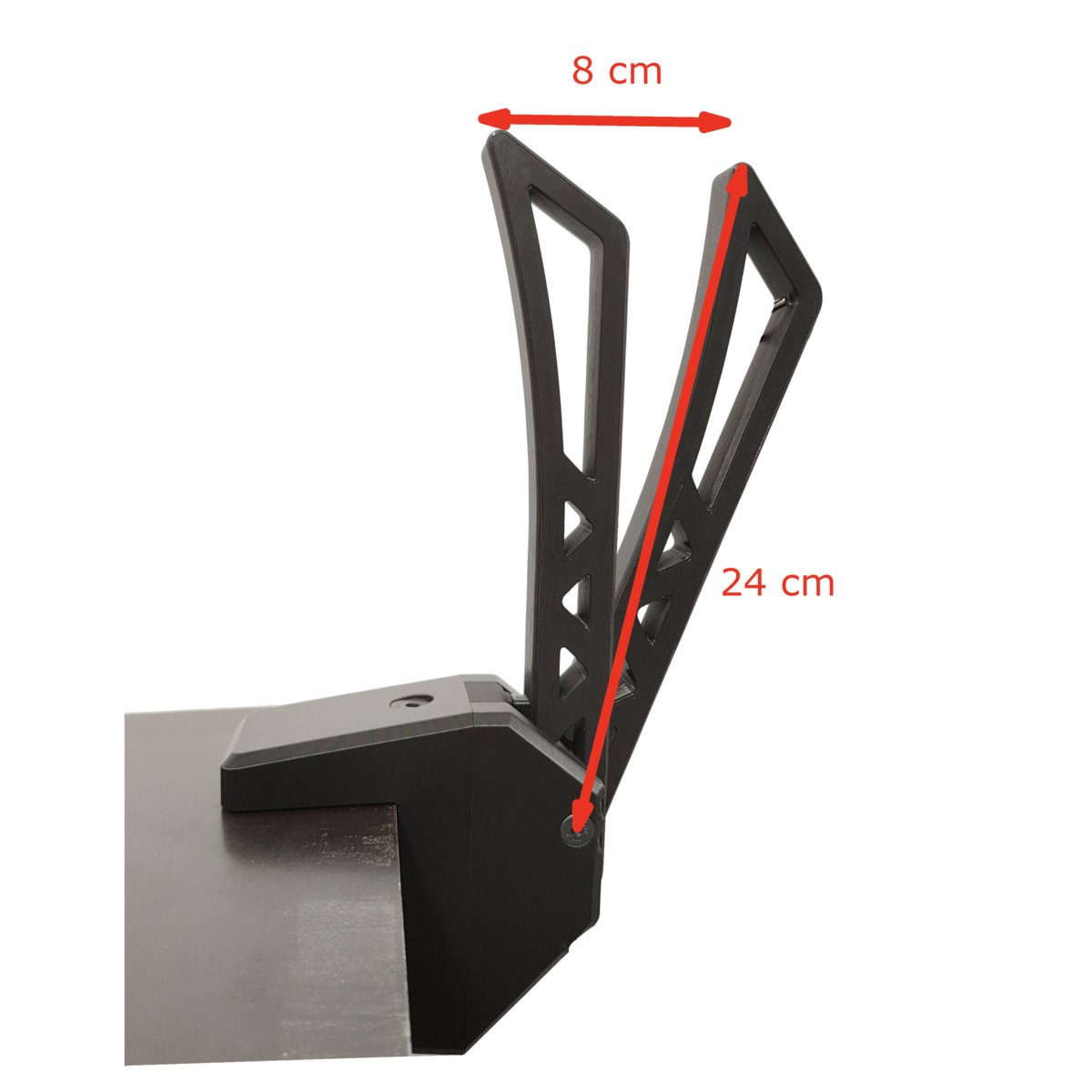 Dźwignia hamulca od łożyska do samej góry ma 24 cm.Szerokość mocowania to 6 cm (tyle miejsca potrzebujemy na biurku).