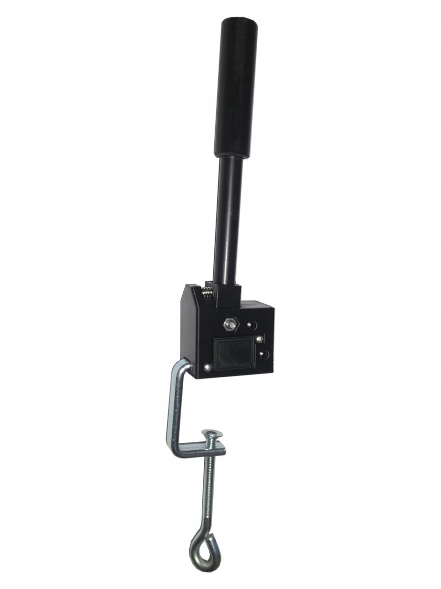 Hamulec mocujemy do blatu za pomocą porządnego ścisku stolarskiego który dołączony jest w zestawie. Zastosowanie takiego rodzaju mocowania pozwala na bardzo mocne zamontowanie hamulca do blatu, zapobiegając przesuwaniu, luzowaniu itd., nawet bardzo mocne, gwałtowne zaciągnięcia nie robią na nim wrażenia, trzyma się bardzo mocno. Maksymalna grubość blatu wynosi 45mm.