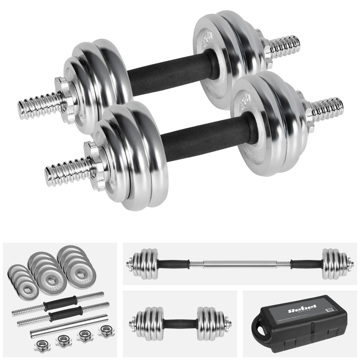 Hantle stalowe w walizce z gryfem, zestaw 15 kg Rebel Active