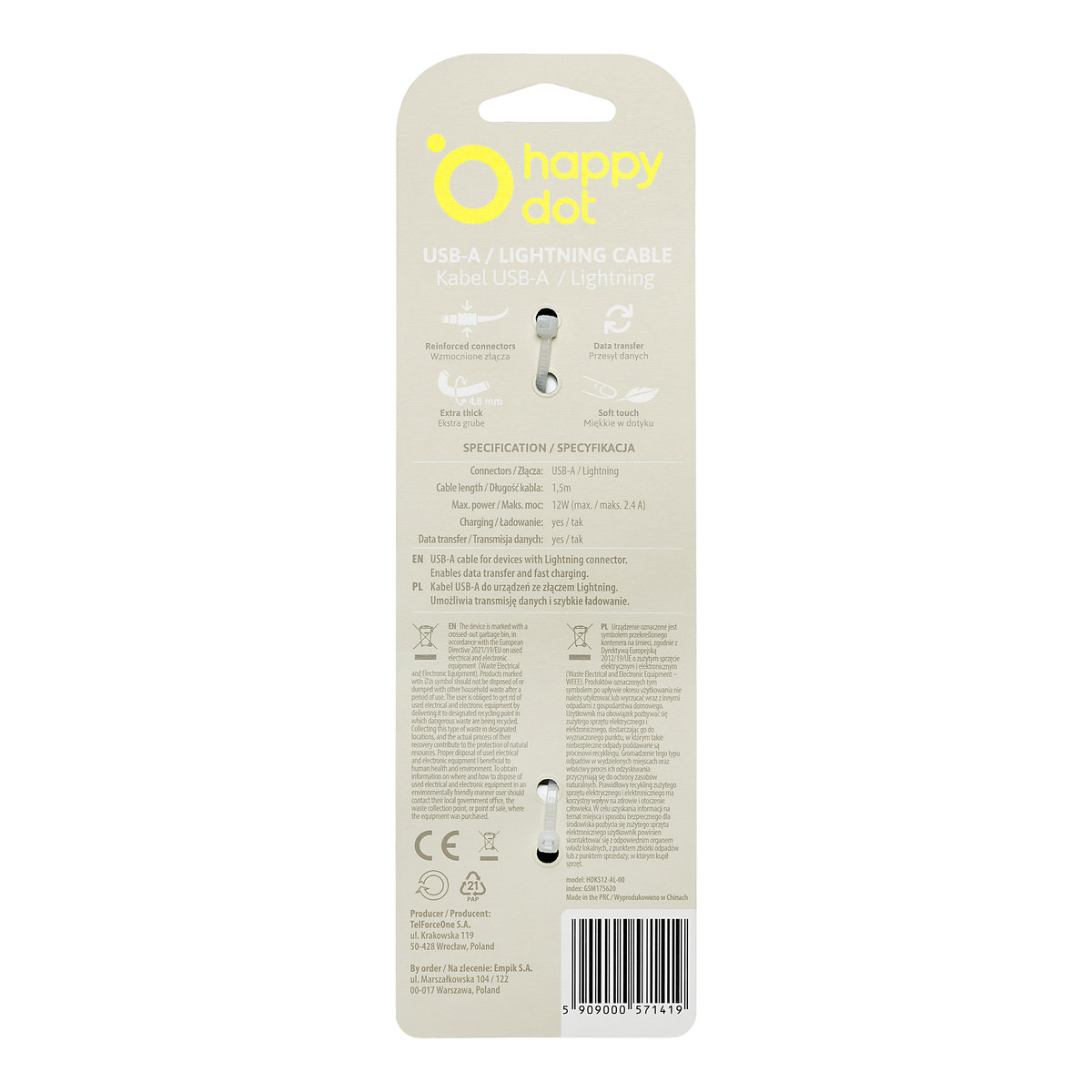 | Nazwa: | HappyDot Kabel USB-A/Lightning 12W biały |