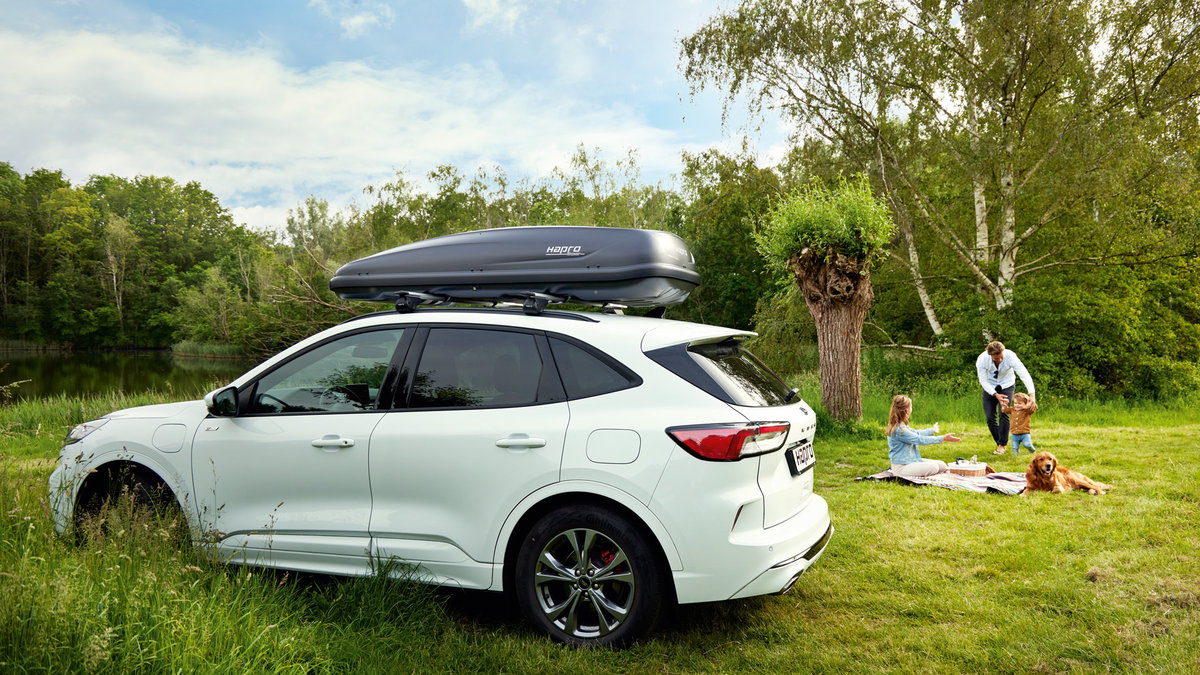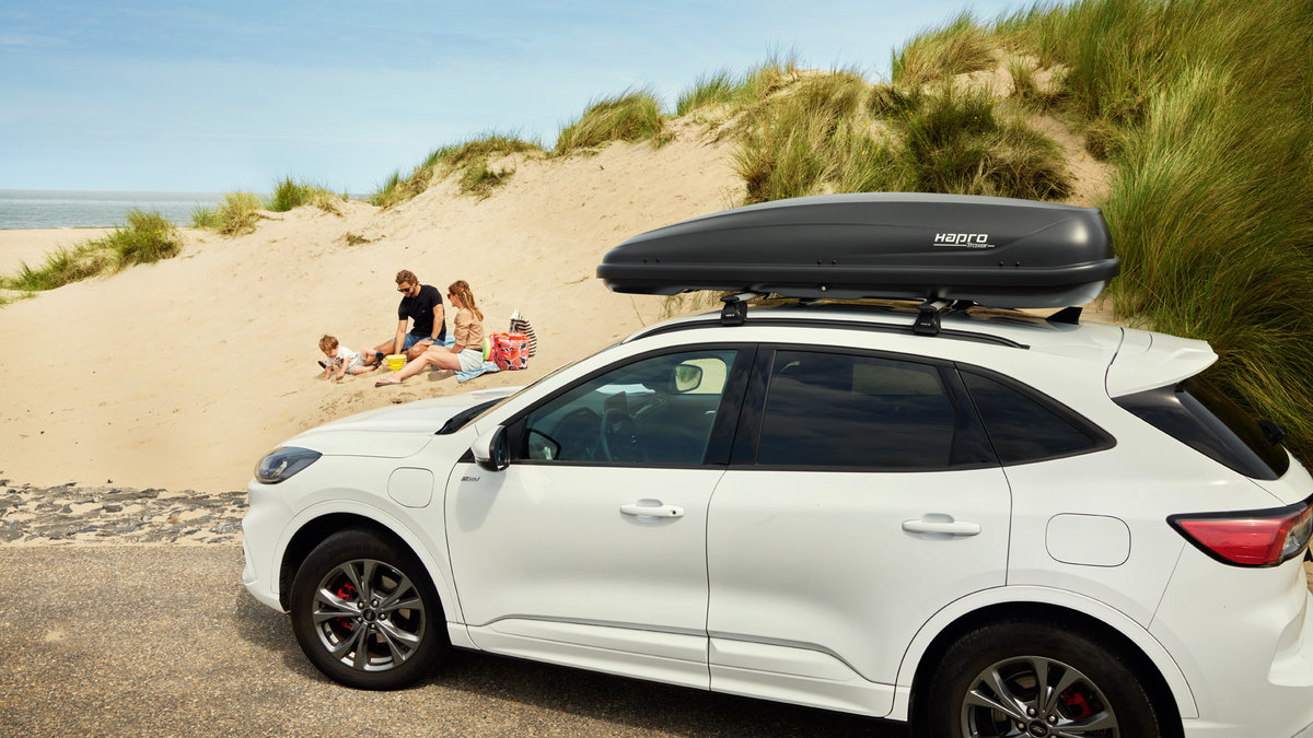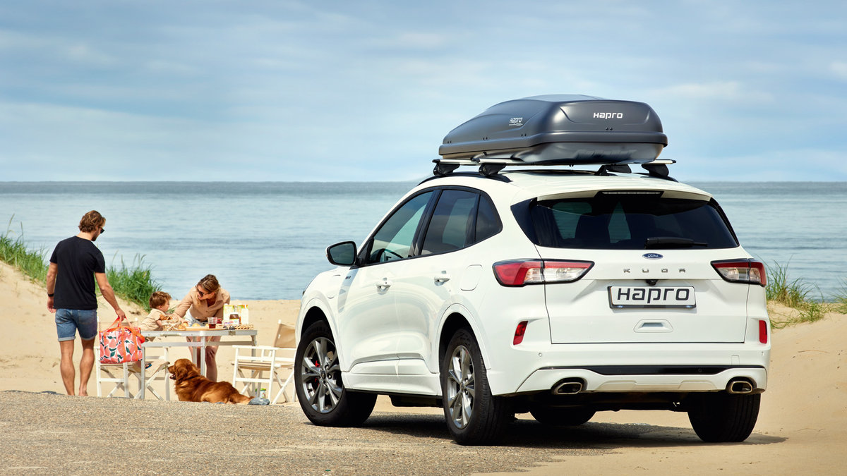 Boxy na dach Hapro Traxer charakteryzuje aerodynamiczny kształt, który podkreśla sylwetkę samochodu.