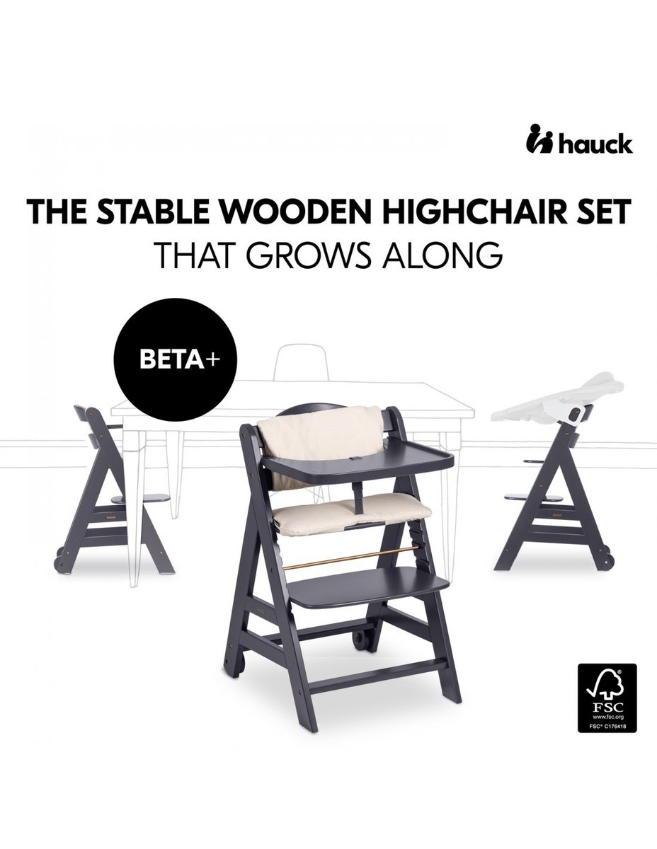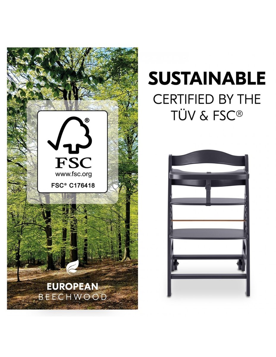 Hauck wnosi swój wkład w ochronę środowiska dzięki drewnianemu krzesełku Beta+. Przetworzone drewno z ekologicznych europejskich upraw drzew bukowych.