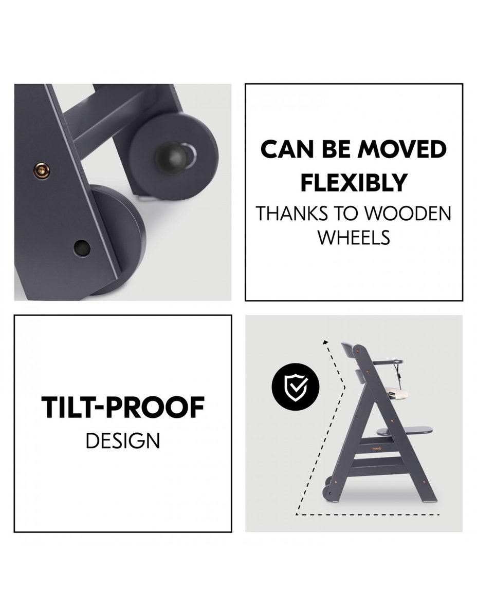 Drewniane krzesło typu grow-along może być wykorzystywane na różne sposoby. Taca na jedzenie lub uchwyt z przodu z 5-punktowym pasem lub osłoną krocza. 5-punktowy system pasów jest mocowany z tyłu za pomocą rzepów i może być dostosowywany do wielkości dziecka. Taśmy chroniące krocze montowane są w równie prosty sposób. Pasy można stosować w zależności od potrzeb.