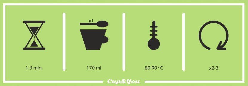 Parzymy wodą o temperaturze 80°- 90° C, 1-3 minuty (w zależności od upodobań związanych z intensywnoscią naparu), 1 łyżeczka suszu na 170ml wody (mała filiżanka), możemy parzyć dwu- lub trzykrotnie.
