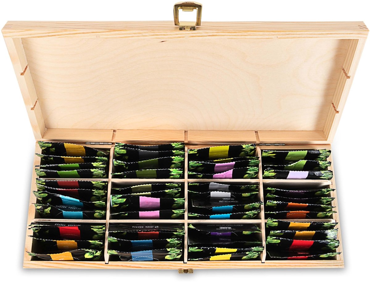 48 szt. herbat liściastych w ozdobnej i praktycznej skrzynce drewnianej Skrzynka z 12 przegrodami o całkowitym wymiarze 347 x 143 x 80 mm wykonana z drewna sosnowego. Przedmiot oferty: zestaw ...