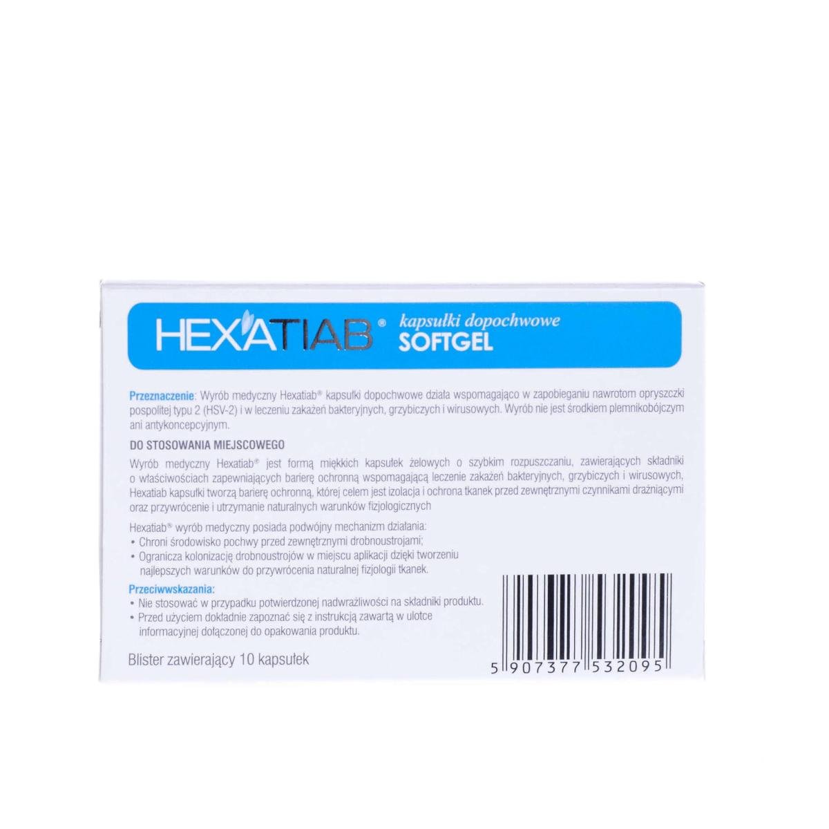 HEXATIAB to kapsułki dopochwowe ma postać roślinnych kapsułek żelatynowych charakteryzujących się szybkim rozpuszczaniem.Przeznaczenie: dopochwowe. To jest wyrób medyczny. Używaj ...