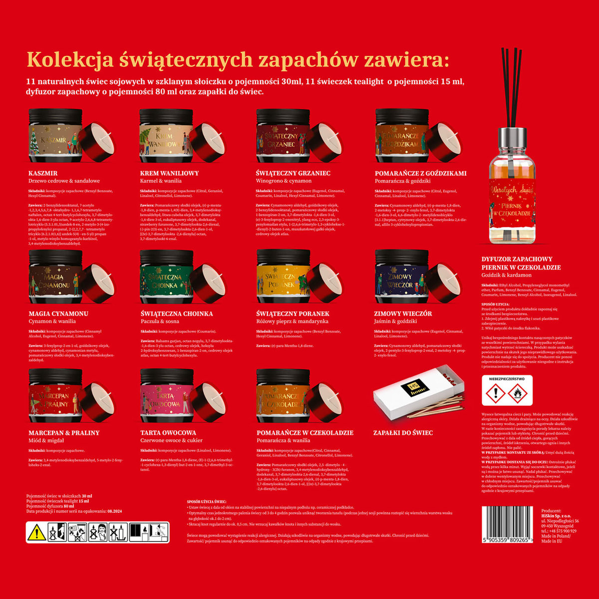 HISKIN MERRY CHRISTMAS HOME Kalendarz adwentowy ze świątecznymi świecami to idealny sposób na wprowadzenie magicznej atmosfery świąt każdego dnia grudnia. Ten wyjątkowy kalendarz zawiera 24 świąteczne świece, z których każda kryje w sobie unikalny zapach inspirowany zimowymi aromatami, takimi jak cynamon, wanilia, czy pomarańcza. Każdego dnia możesz cieszyć się nową świecą, która rozświetli Twój dom i wypełni go przytulnym, świątecznym zapachem.