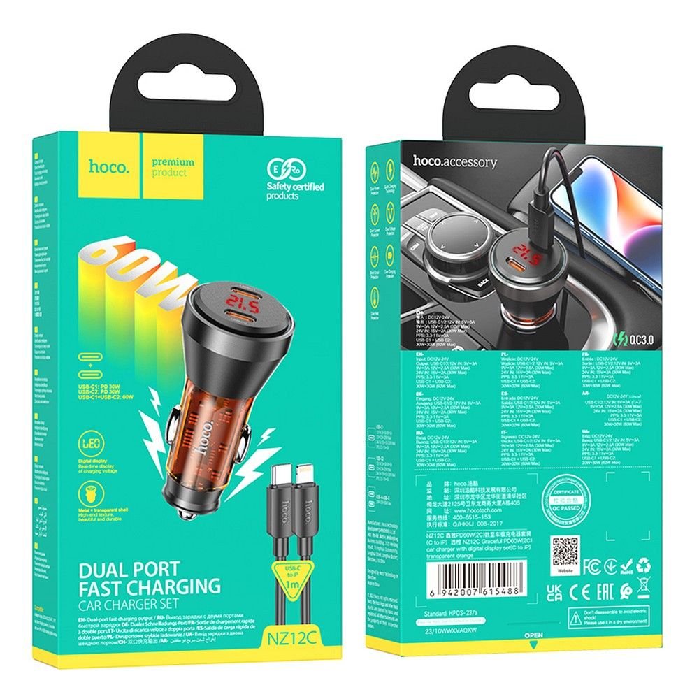 | Nazwa: | HOCO ładowarka samochodowa 2 x Typ C QC 30W z wyświetlaczem + kabel Typ C do Lightning PD60W NZ12C transparentna pomarańczowa |