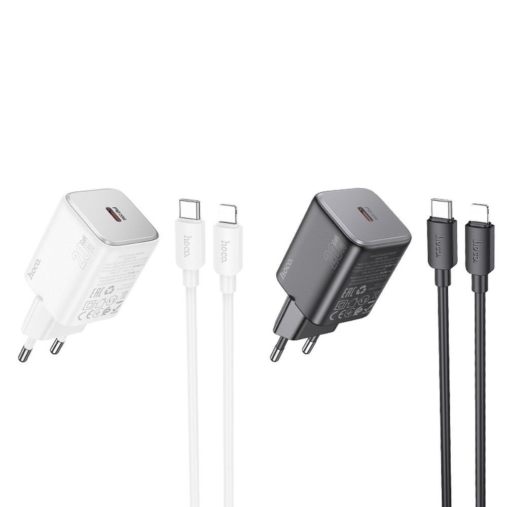 Ładowarka sieciowa Hoco N40 z portem USB-C i obsługą szybkiego ładowania o mocy 20 W. W zestawie z kablem USB-C – Lightning o długości 1 metra.
