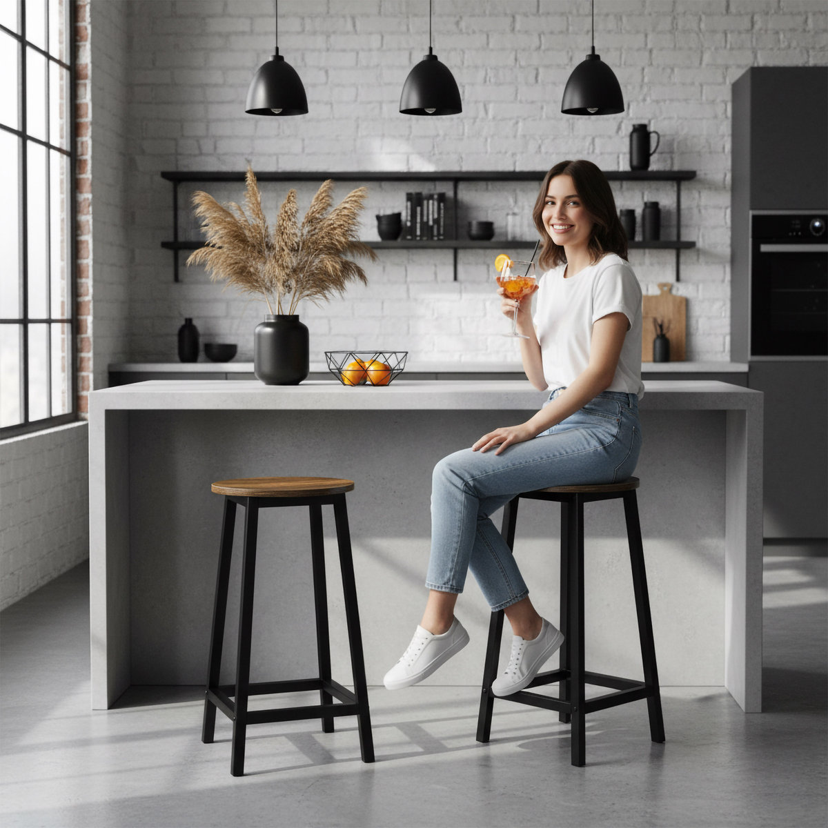 Hoker rustykalny stołek taboret - FLINTKolor: dąb postarzany/czarny matUwaga! Podczas montażu zwróć uwagę na długość śrub. Opakowania z śrubami mogą być błędnie oznaczone.➡️Praktyczny i des ...