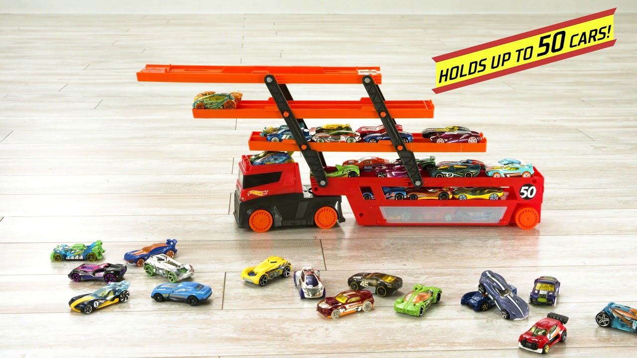 Ten oryginalny pojazd Mega Transporter Hot Wheels® oferujący wyjątkowe funkcje to świetny prezent dla dzieci i kolekcjonerów!
