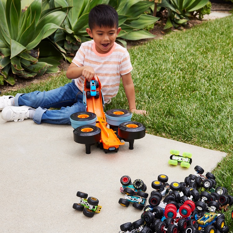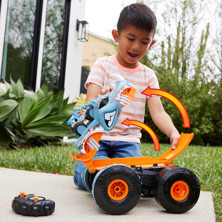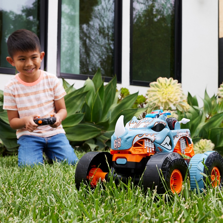 Z zestawem Hot Wheels® Monster Trucks R/C Rhinomite Mega Transformacja możesz zostać królem demolki dzięki zdalnie sterowanemu Monster Truckowi w skali 1:12, który przekształca się w przyspieszacz dla dołączonego pojazdu w skali 1:64.