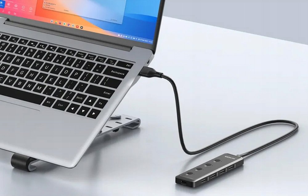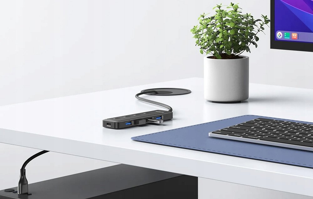 Hub oddaje do Twojej dyspozycji 4 porty USB-A, do których możesz podłączać takie urządzenia jak na przykład dyski zewnętrzne, klawiatury, drukarki i wiele więcej. Każdy z nich ma niezależny przełącznik, dzięki czemu możliwe jest wygodne zarządzanie podpiętymi sprzętami. Produkt ma również port USB-C 5 V, który pozwala zapewnić dodatkowe źródło zasilania dla pozostałych gniazd. To z kolei przekłada się na jego bardziej wydajną i niezawodną pracę.