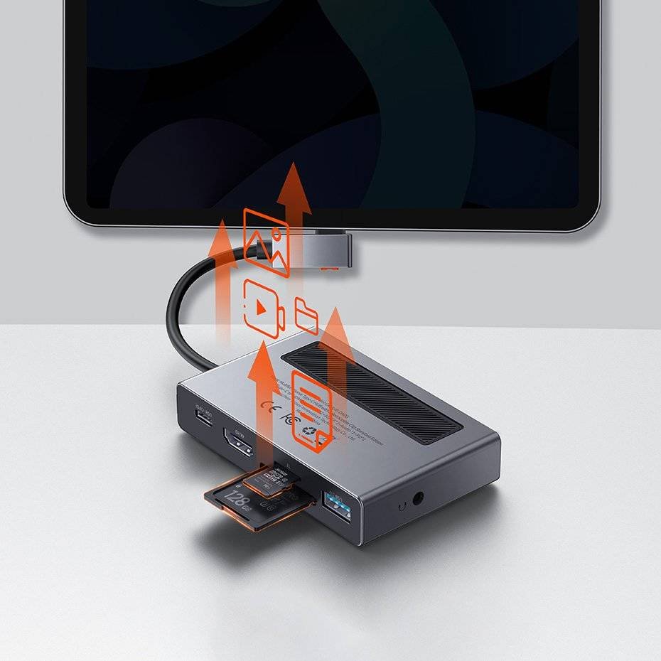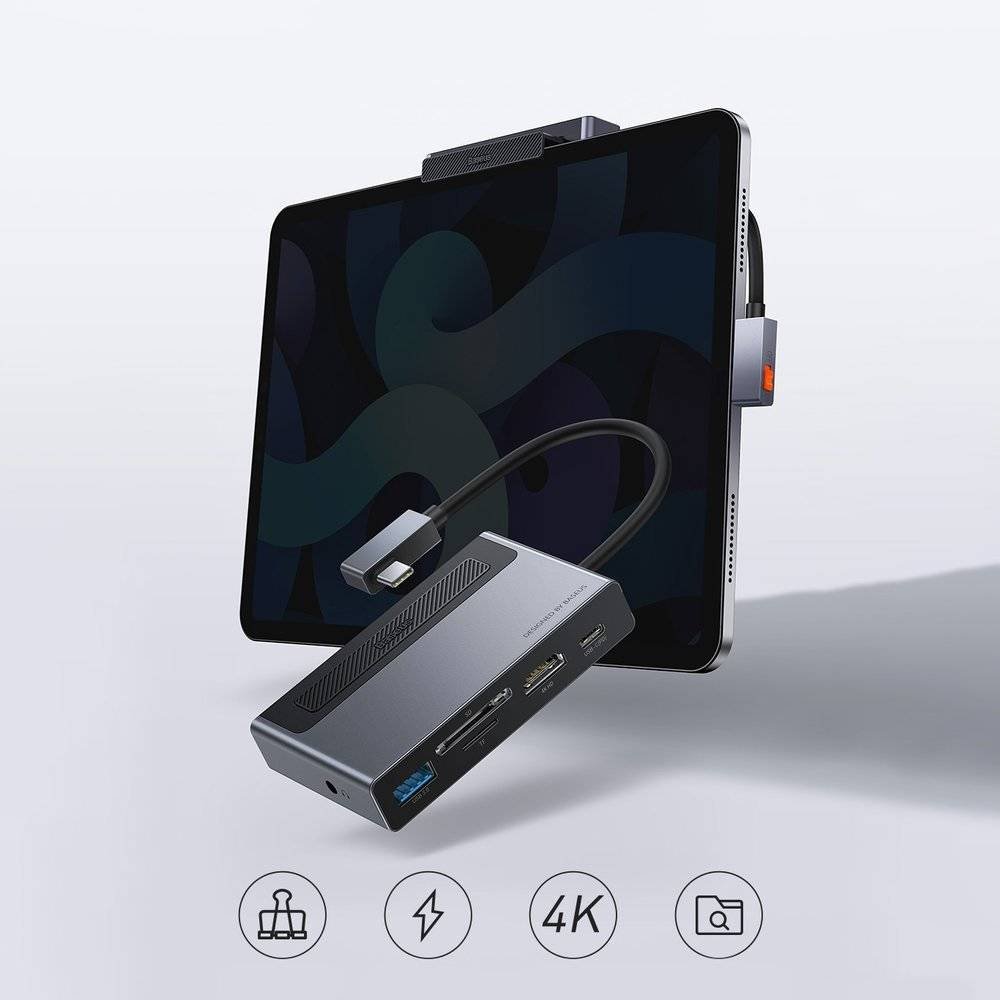 Problem braku wolnych portów w laptopie lub tablecie jest Ci znany? Hub 6w1 marki Baseus pozwoli Ci o nim zapomnieć! Kompatybilny z wieloma różnymi urządzeniami - znacznie zwiększy Twoje możliwości podczas pracy, nauki, a nawet zabawy. Został wyposażony w 6 portów - w tym między innymi USB 3.0, audio jack, USB-C i HDMI. Obsługuje szybkie ładowanie PD 100 W oraz wyświetlanie obrazu 4K. Za jego pomocą możesz używać 2 kart pamięci jednocześnie i przesyłać pliki z prędkością do 5 Gbps. Specjalny klips umożliwia wygodny montaż urządzenia na tablecie.