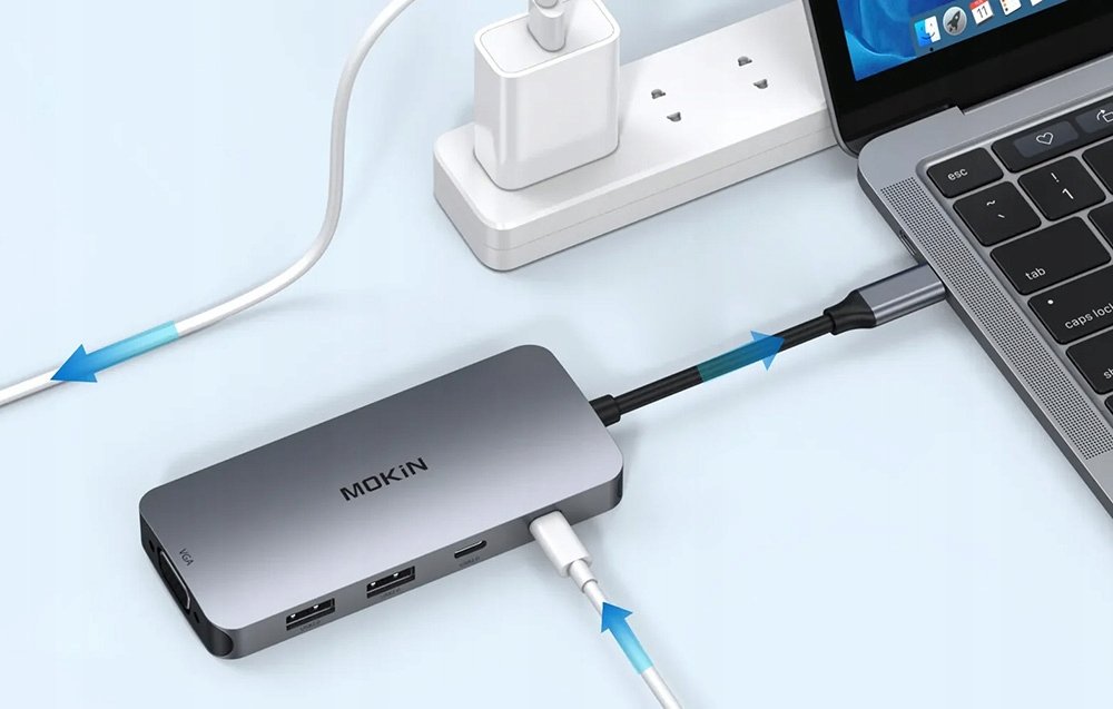 Podłącz dodatkowy sprzęt do swojego laptopa i ciesz się efektywniejszą pracą. Hub 8 w 1 marki MOKiN oddaje do Twojej dyspozycji dwa porty HDMI, port DP, port VGA, dwa porty USB-A 2.0, port USB-C 2.0 oraz port USB-C PD. Dzięki temu umożliwia między innymi podłączanie monitorów, dysków zewnętrznych i nie tylko! Urządzenie pozwala też na szybkie przesyłanie plików (do 480 Mbps) i jest bardzo wygodne w obsłudze.