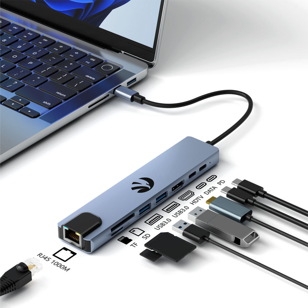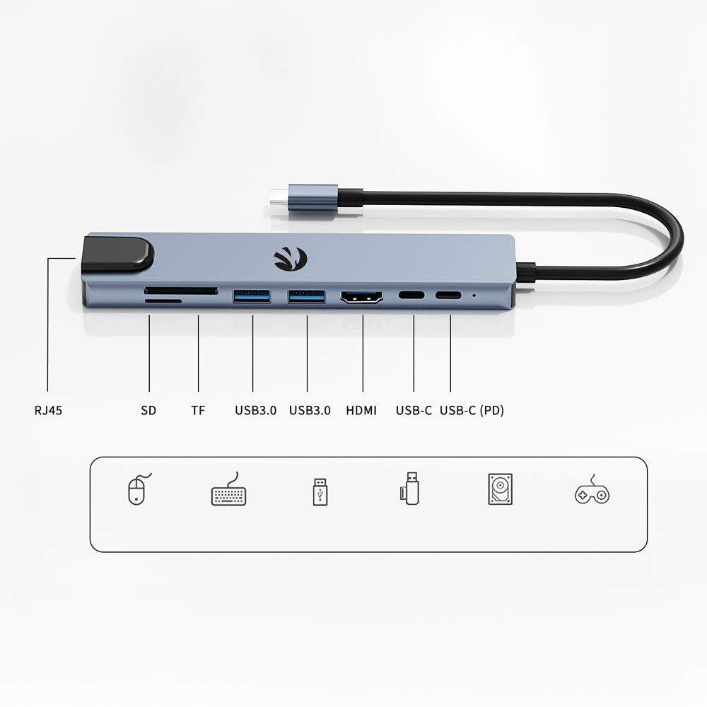 Wielofunkcyjny Hub 8w1 – Pełna wszechstronność Nasz Hub 8w1 to zaawansowane narzędzie, które rozszerza funkcjonalność Twojego laptopa, tabletu czy smartfona, oferując aż osiem różnych portów. Z jego pomocą podłączysz zewnętrzne monitory w jakości 4K, przesyłasz dane z prędkością do 5 Gbps, korzystasz z szybkiego internetu dzięki złączu LAN 1000 Mbps oraz ładowania Power Delivery do 87W. To urządzenie stworzone z myślą o wymagających użytkownikach, którzy potrzebują maksymalnej wydajności w kompaktowym formacie.