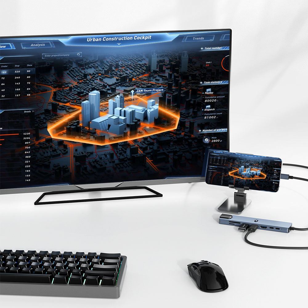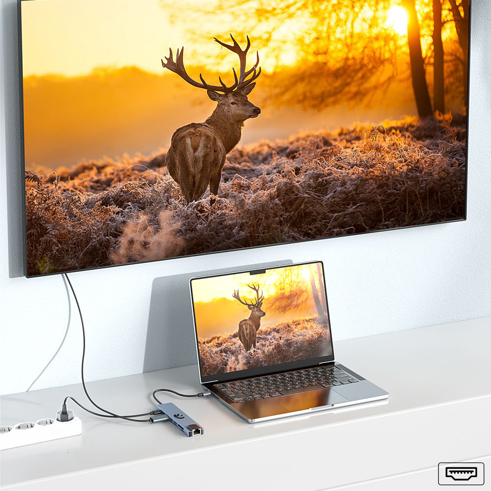 HDMI 4K UHD – Idealny dla pracy i rozrywki Dzięki złączu HDMI 4K UHD, możesz podłączyć monitor lub telewizor i cieszyć się najwyższą jakością obrazu w rozdzielczości 3840x2160 (30 Hz). Dodatkowo, port obsługuje Full HD (1080p) przy 60 Hz, co czyni go idealnym wyborem zarówno do pracy, jak i oglądania filmów, prezentacji czy gier. Niezależnie od tego, czy pracujesz z grafiką, edytujesz filmy, czy po prostu potrzebujesz większego ekranu, ten hub zapewni doskonałą wydajność i jakość.