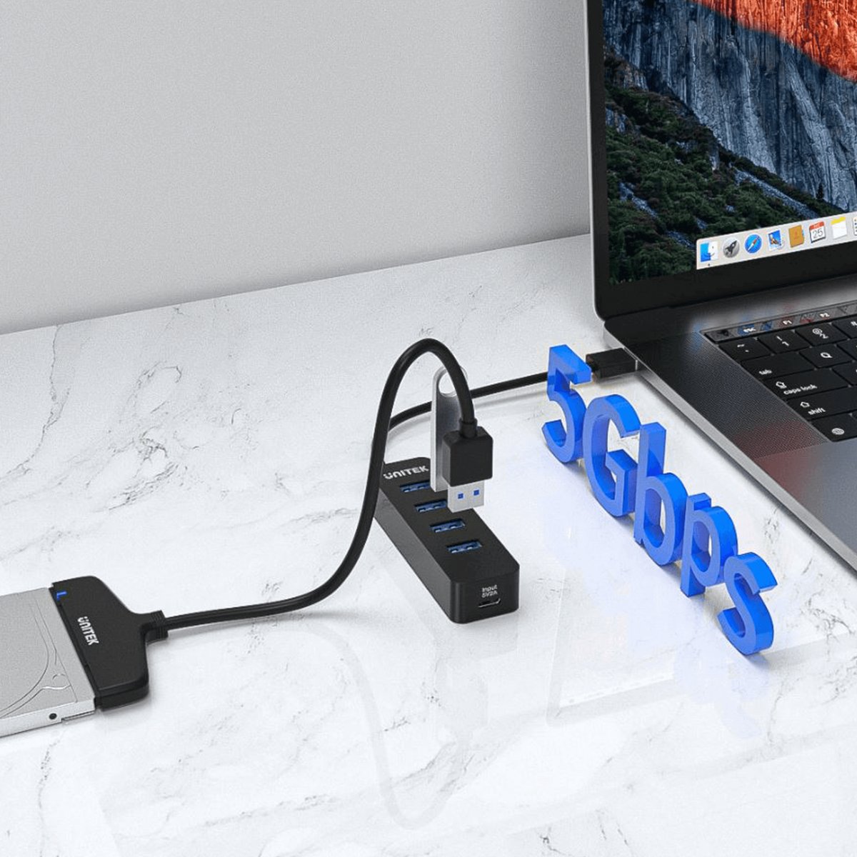 Hub doskonale sprawdzi się przy transferze danych. Złącza USB 3.2 Gen 1 zapewniają transfer do 5Gbps. Dla przykładu, kopiowanie filmu w rozdzielczości 1080p, ważącego 8GB, trwa zaledwie 14 sekund. Dla porównania, poprzedni standard, USB 2.0, z prędkością 480 Mbps taki plik przesyłałby 2 minuty 30 sekund.