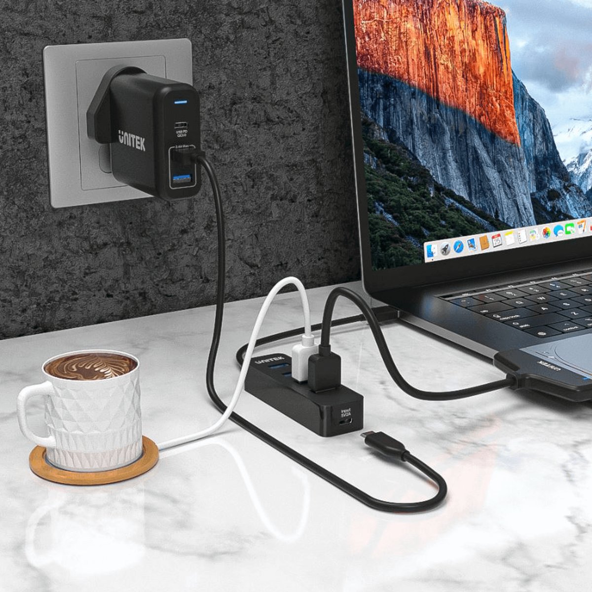 Aktywny hub USB od Unitek umożliwia podłączenie do czterech urządzeń z portem USB-A w jednym miejscu. Mogą być to nanoodbiorniki od peryferii komputerowych (myszka, klawiatura) czy gadżety, takie jak lampka czy wiatraczek, a nawet obudowa z dyskiem twardym. To wygodne rozwiązanie, zwłaszcza, kiedy laptop albo pecet ma ograniczoną ilość portów. Z niewielką ilością portów mają do czynienia choćby użytkownicy MacBooków. W nowych modelach nie ma już portów USB-A. Dzięki technologii Plug and Play hub nie wymaga instalacji sterowników. Jest też kompatybilny z systemami operacyjnymi Windows, Mac i Linux.