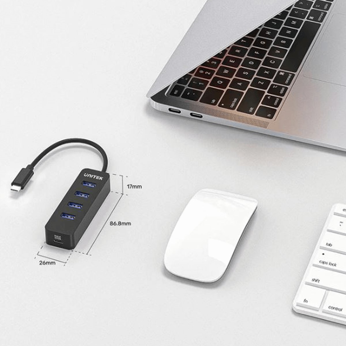 Cztery porty USB-A Aktywny hub USB od Unitek umożliwia podłączenie do czterech urządzeń z portem USB-A w jednym miejscu. Mogą być to nanoodbiorniki od peryferii komputerowych (myszka, klawiatura) czy