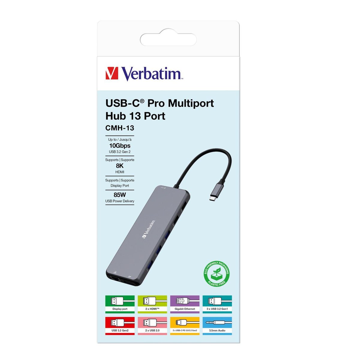 Hub USB Verbatim Multi Port CMH-13 to wielofunkcyjne urządzenie, które poszerza możliwości podłączenia różnych urządzeń do komputera czy laptopa. Wyposażony w dwa porty USB-C PD umożliwia szybkie ładowanie podłączonych urządzeń. Posiada jeden port USB-A 3.1 zapewniający szybki transfer danych, trzy porty USB-A 3.0, które są kompatybilne z wieloma urządzeniami oraz dwa porty USB-A 2.0. Dodatkowo, hub oferuje dwa porty HDMI, port DisplayPort oraz port RJ-45, co umożliwia podłączenie zarówno monitorów, jak i połączenia sieciowego. Obecność wyjścia audio pozwala na podłączenie zewnętrznych głośników czy słuchawek.