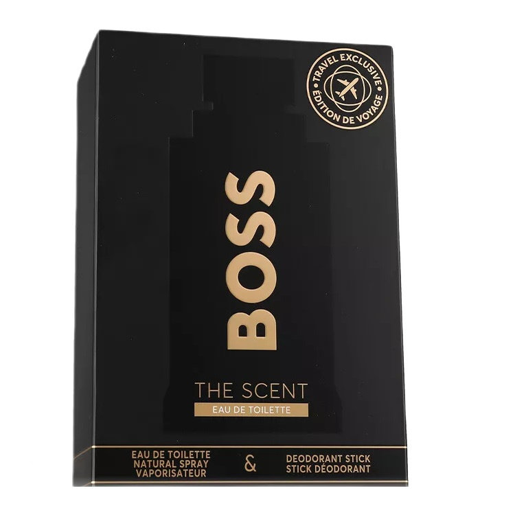 Zestaw zapachowy Boss The Scent zawiera wodę toaletową o pojemności 100ml oraz dezodorant w sztyfcie o pojemności 75ml.