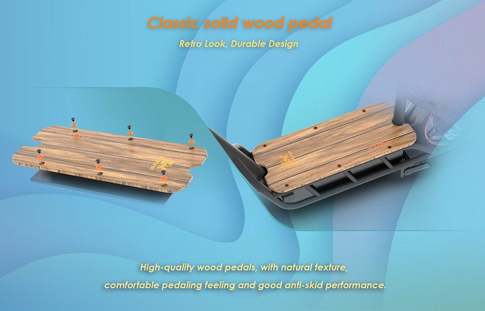 Preferowane gumowe opony pneumatyczne KuKirin C1 Pro, opony o szerokości 2,5 cala ze specjalną konstrukcją bieżnika, zwiększają tarcie między bieżnikiem a powierzchnią drogi, hamują tendencję do poślizgu bieżnika, skracają drogę hamowania i sprawiają, że podróż jest wygodniejsza i płynniejsza.Antypoślizgowy pedał z litego drewna