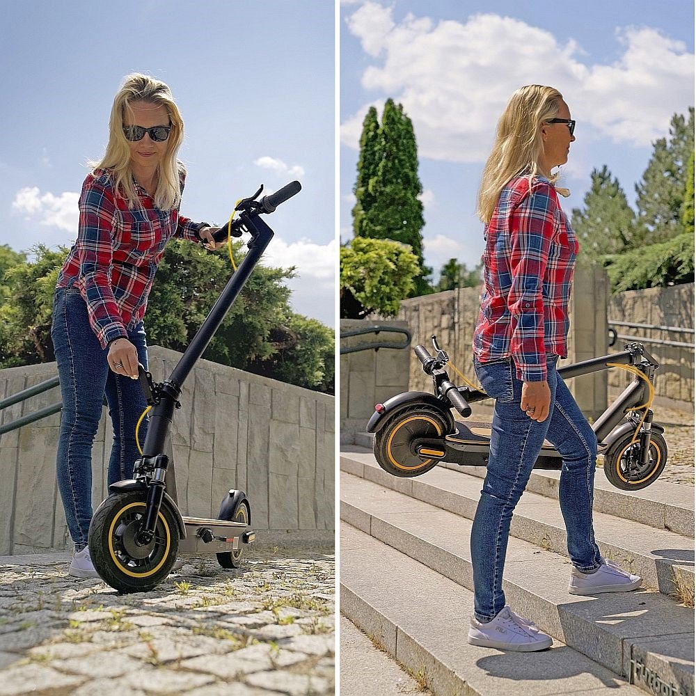 Podwójna amortyzacja (przednia i tylna) oraz 10‑calowe pompowane opony bezdętkowe, zwiększają komfort jazdy i odporność na nierówności terenu