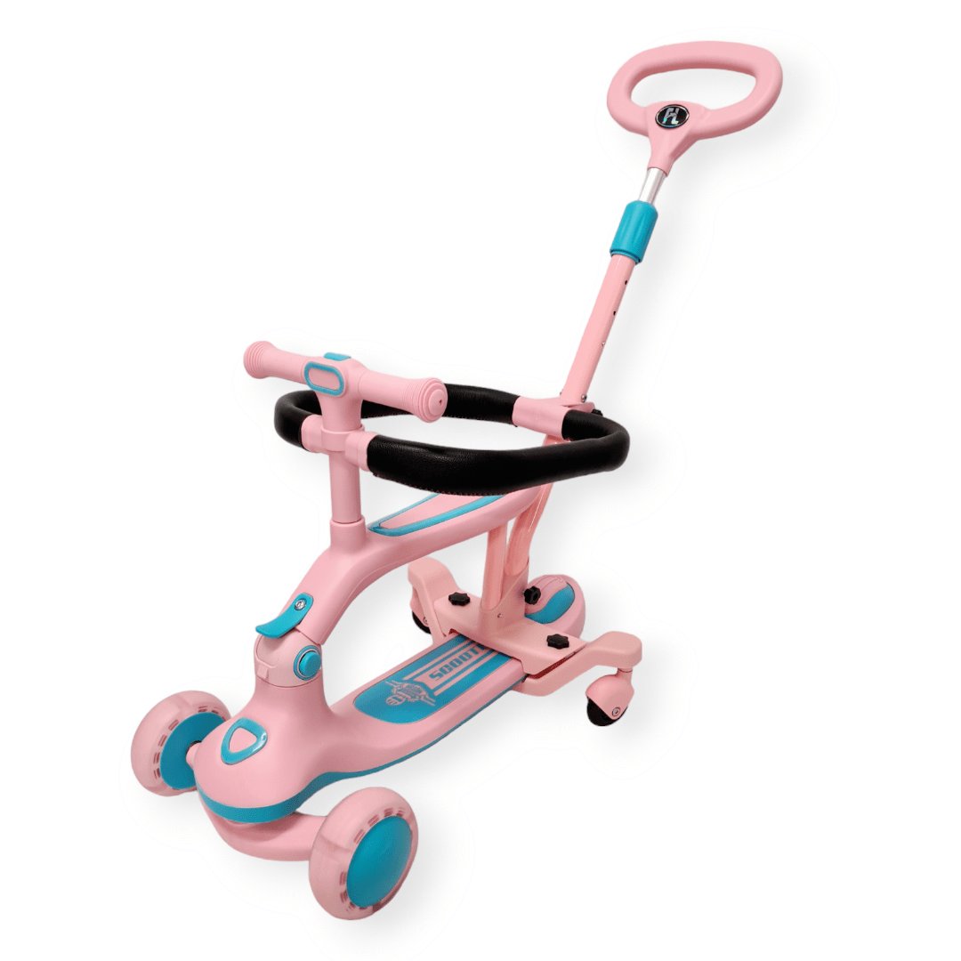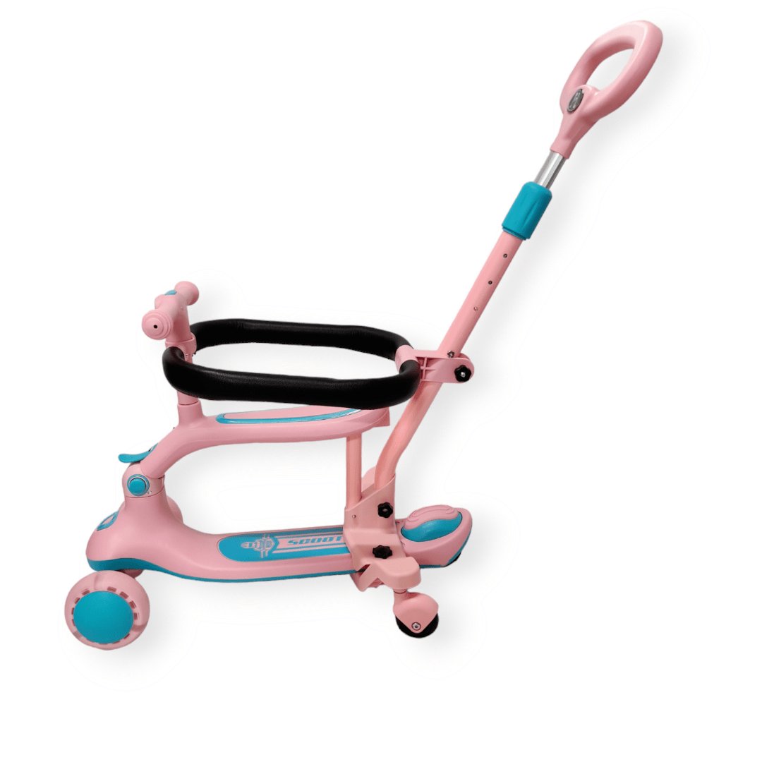 Koła pomocnicze boczne dodane do pozycji tylnej w funkcji jeździka pozwalają na wygodne obracanie hulajnogą na prawo i lewo mimo, że hulajnoga i jeździk jest hulajnogą balansową. Dzięki dodatkowej konstrukcji jest idealna na pierwsze spacery dla maluszka, który już siedzi i jest ciekawy świata poza wózkiem. Rodzic z tyłu może swobodnie obracać hulajnogą w lewo i prawo (nawet kręcić kółka 360 stopni) za pomocą kija, a dziecko bezpiecznie siedzi. Otacza go pałąk.