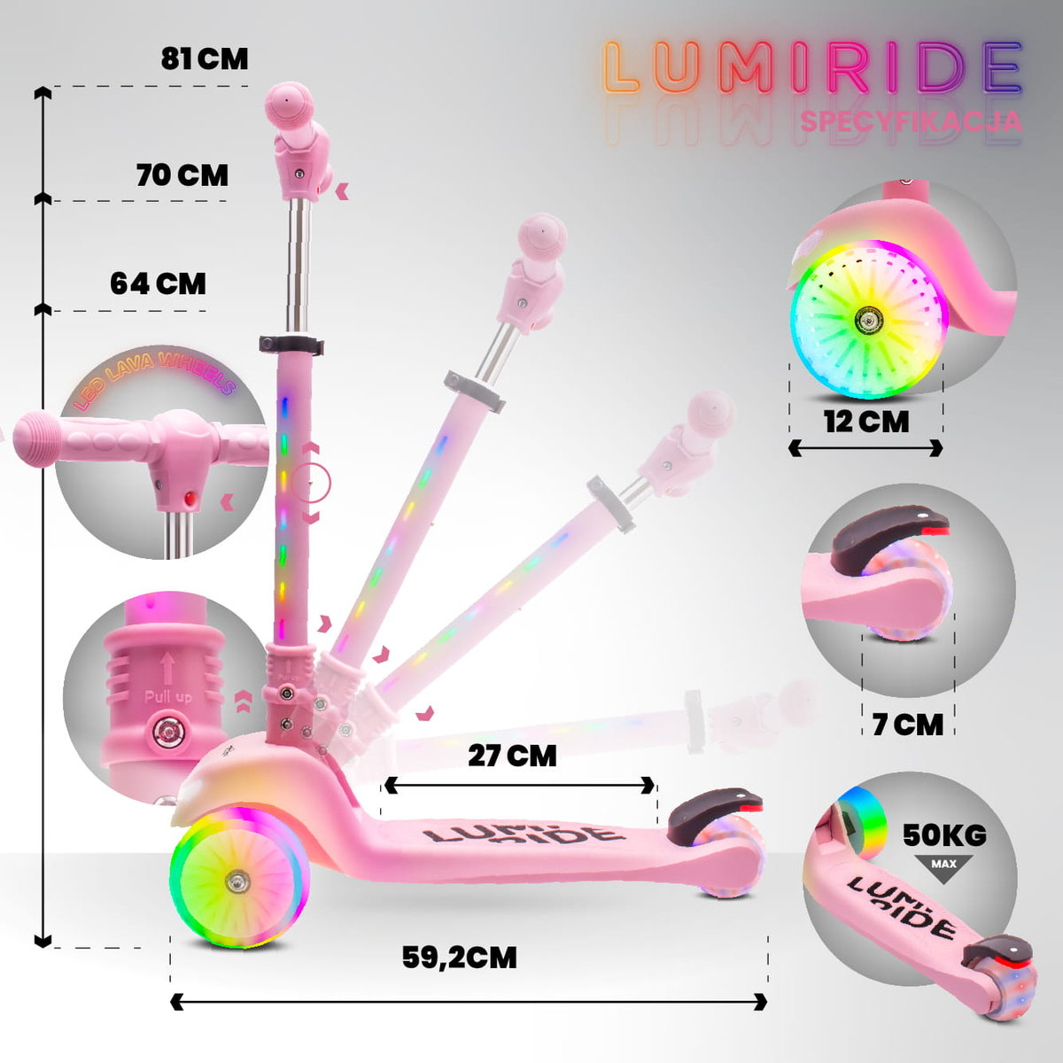 Sun Baby Hulajnoga trójkołowa balansowa składana regulowana Koła tęcza Lumiride LED 7 kolorów 20 programów różowy Cechy produktu : ✔️ wiek: 3+ ✔️ maksymalne obciążenie: 50 kg ✔️ materiał kół: PU ...