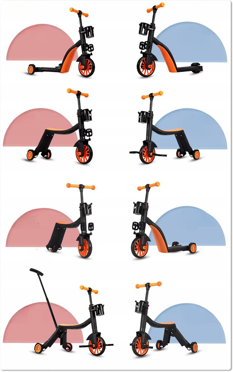 Uniwersalność i funkcjonalność: Jeden pojazd, osiem możliwości - Push Walker, Tricycle-scooter, Two-wheel balance car, Three-wheeled balance car, Three-wheeled scooter, Two-wheeled scooter, Three-wheeled tricycle, Trike.