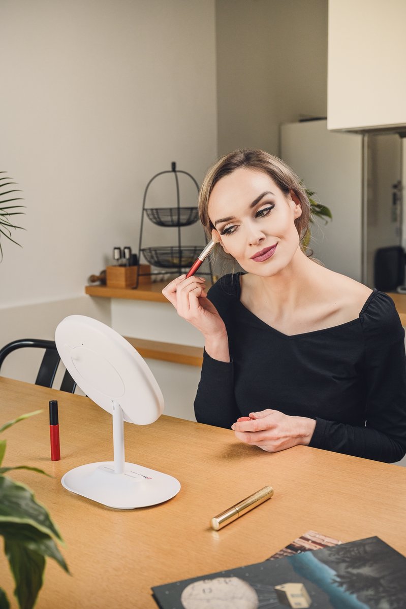 Lusterko wykorzystuje długowieczne, energooszczędne diody LED, których moc możesz regulować w zależności od swoich potrzeb. Duża siła sprawdza się w słoneczny dzień, natomiast mniejsza po zmroku lub w ciemnym pomieszczeniu. Idealnie zbalansowane światło nie razi w oczy, co zdecydowanie ułatwia pracę nad charakteryzacją.